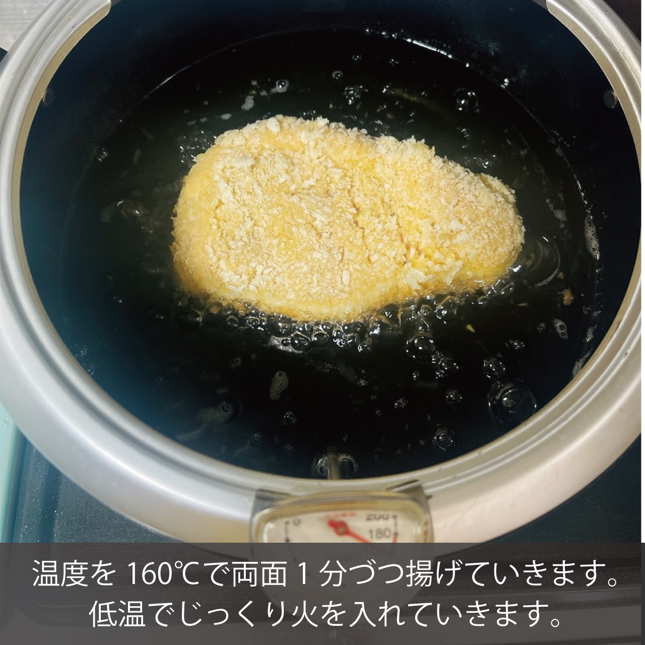 油の量は豚肉が半分浸かるくらいの量で、鍋の温度を160℃豚肉の片面1分、ひっくり返して1分揚げて取り出し、アルミホイルに包み4分休ませます。再度30秒づつ両面を揚げてアルミホイルに包み2分休ませて揚げは完了です。