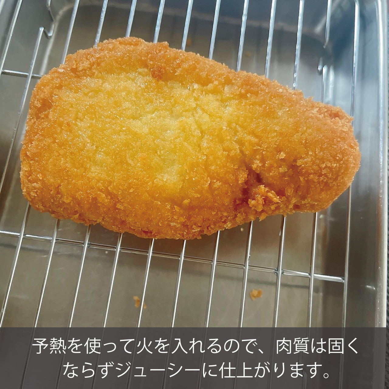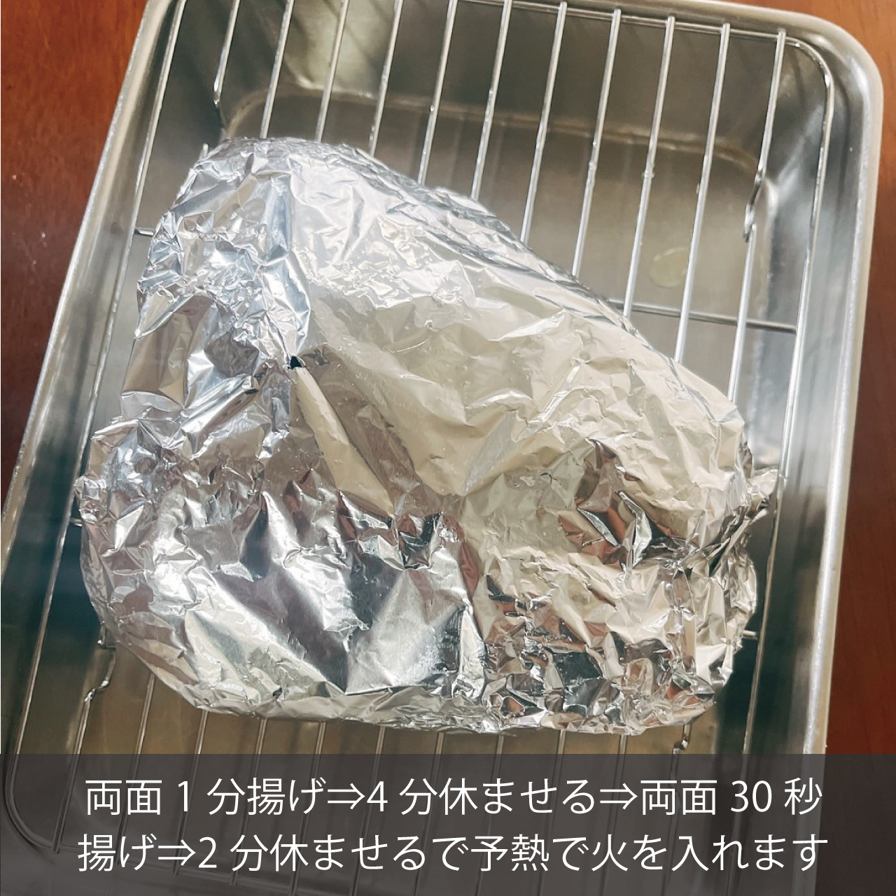 豚肉を160℃の低温で両面を1分揚げる⇒アルミホイルを巻いて4分休ませる(予熱で火を通す)⇒両面30秒揚げる⇒アルミホイルを巻いて2分休ませる。低温で揚げ予熱で火を通す事で、肉質が固くならずにジューシーな仕上がりになる。この辺りはとんかつの180℃でカラッと揚げるのとはちょっと方法が違いますね。
