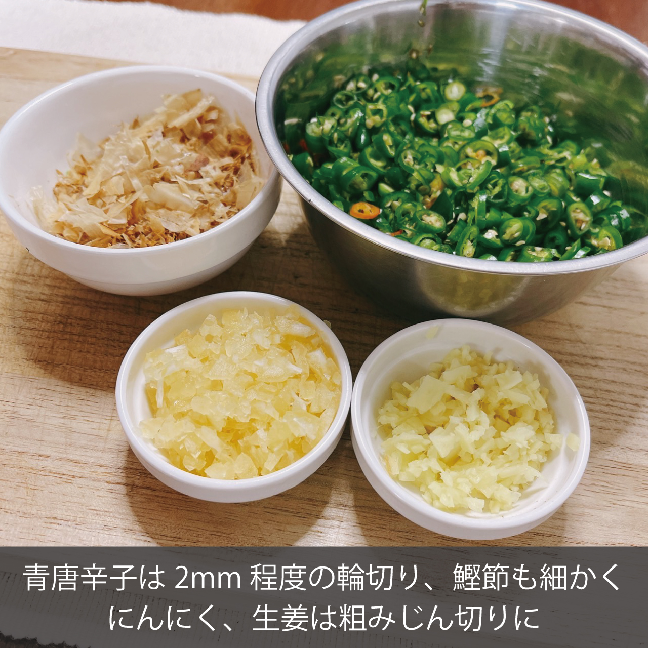 ①青唐辛子を洗いしっかりと水を切ります。ヘタをとって1mmから2mm程度の輪切りに刻んでいきます。