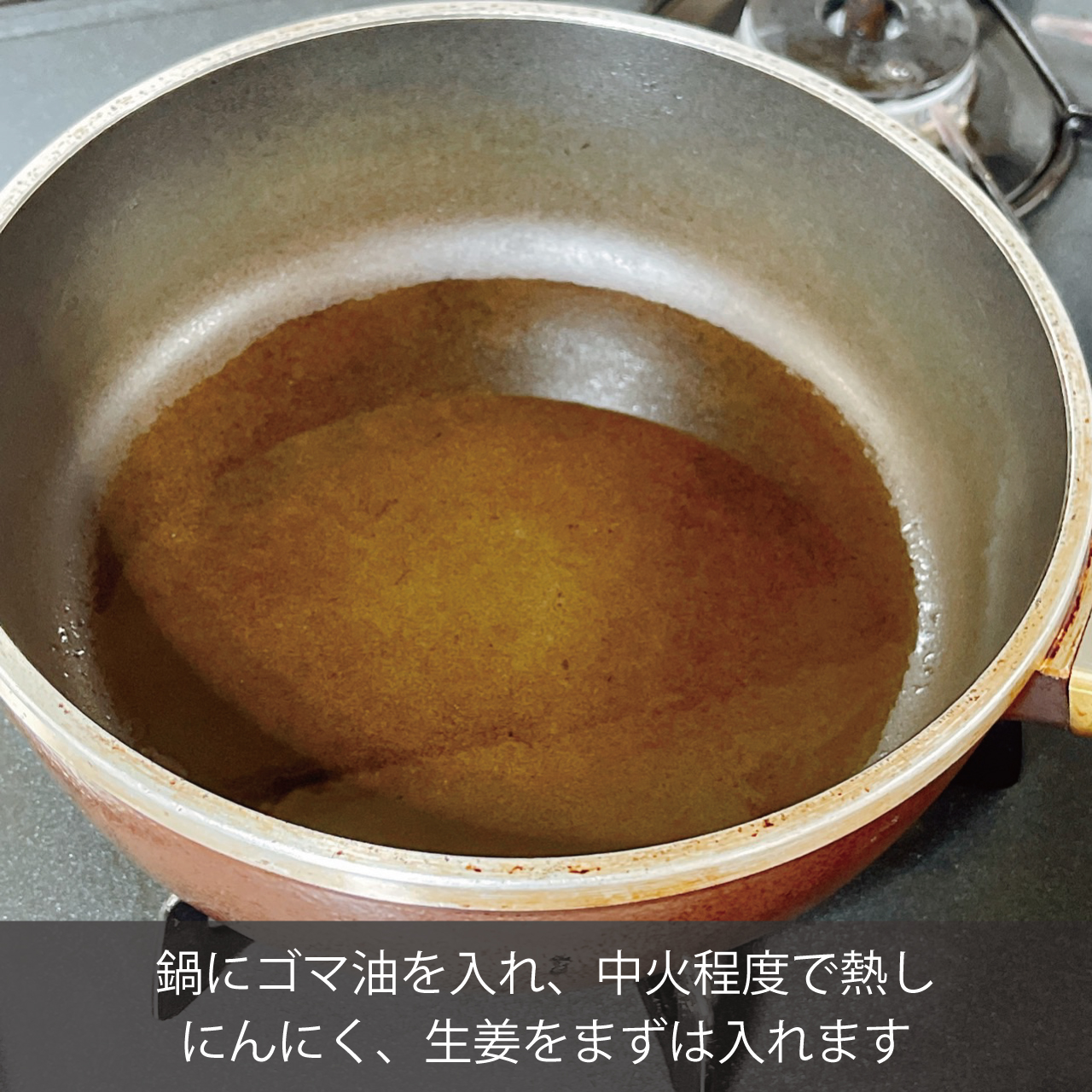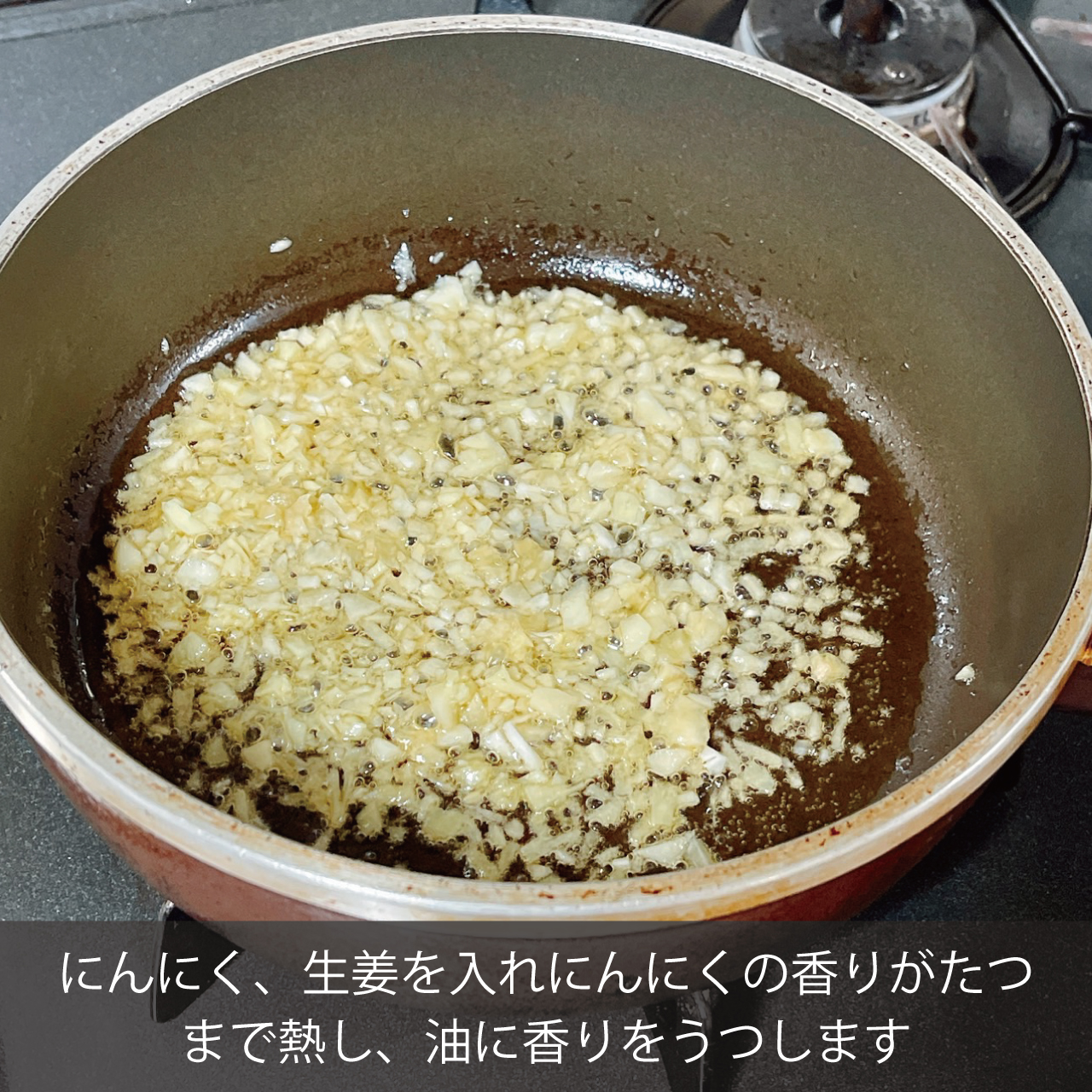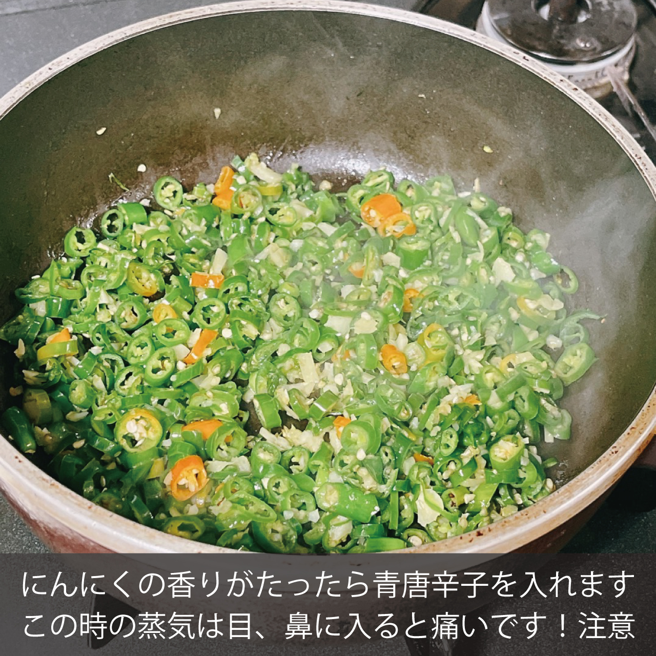 ③鍋にゴマ油を入れ、にんにく、生姜を入れ炒めます。にんにくの香りが立ってきたら青唐辛子を刻んだ物を入れます。