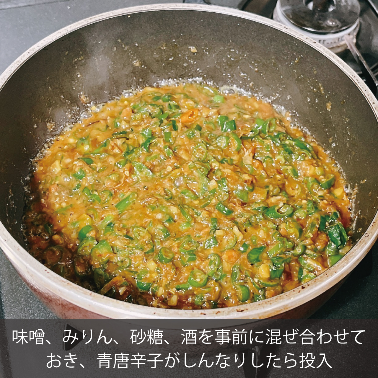 ところが、今回の青唐辛子が大当たり級の辛さでして。途中で味見をしたんですが味見しただけでビリビリしてずっと口の中が痛いという自体に。