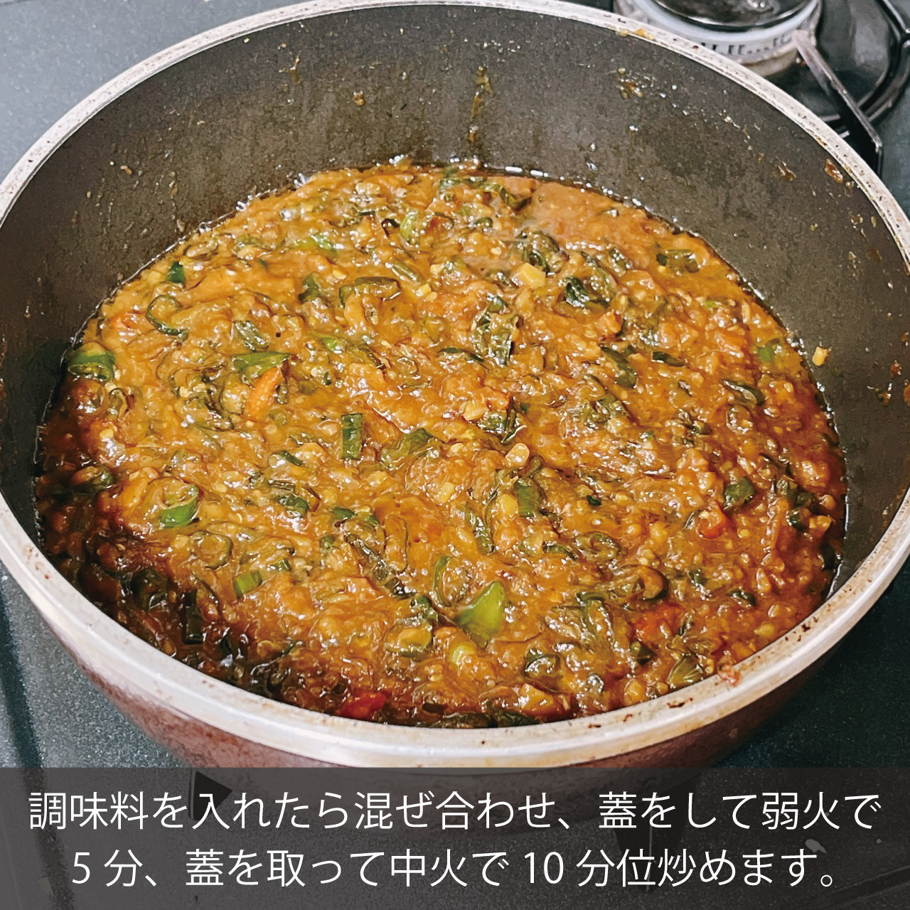 ⑥5分たったら蓋をとり、弱火から中火程度でさらに炒めます(焦げ付きやすくなっているので、絶えずかき混ぜてください。)