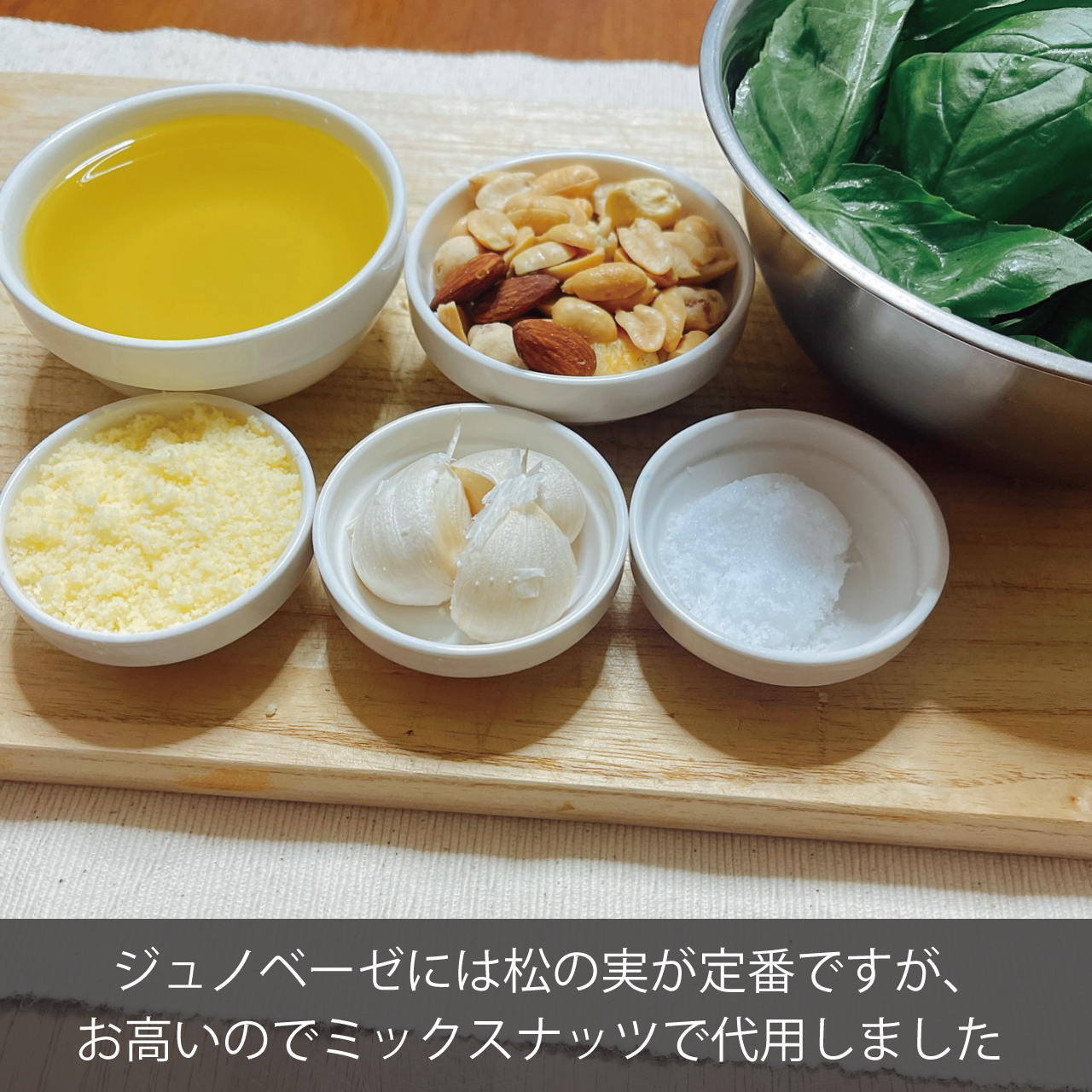 ナッツとオリーブオイルの量に対してバジルが足りず。全然バジルの爽やかさがない、重いナッツオイルのパスタが仕上がりました…。美味しくない…。