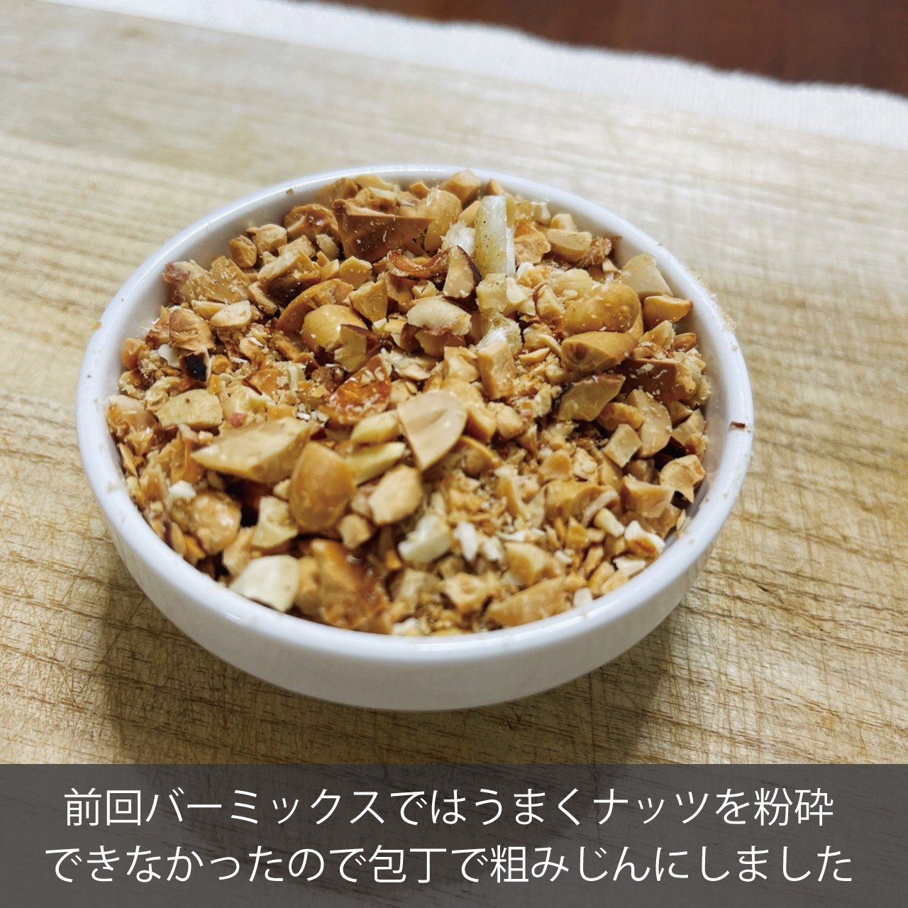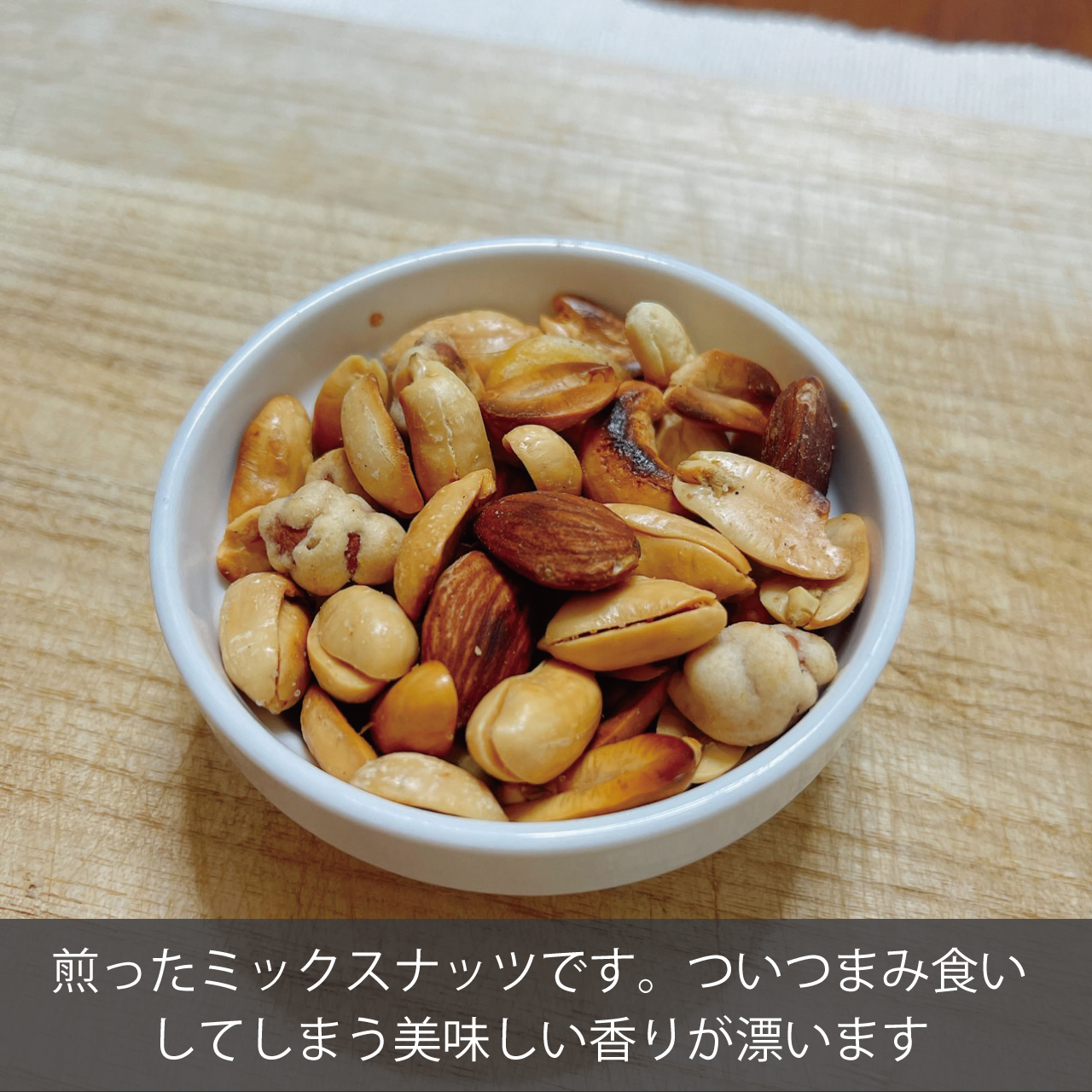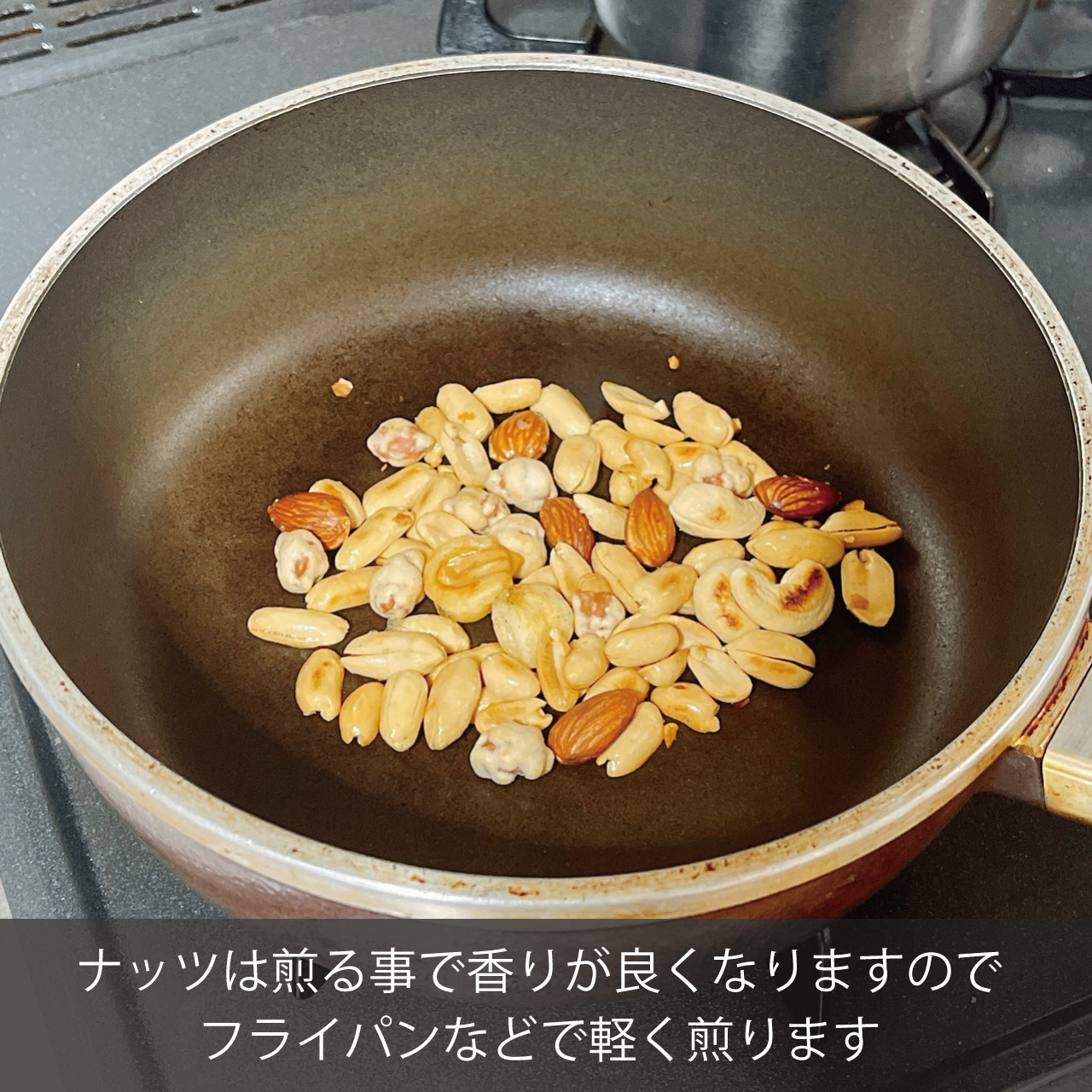 ②ミックスナッツをフライパンで煎って香ばしい香りを出す。ミキサーにかけずらいナッツがあれば包丁等で細かく砕く。