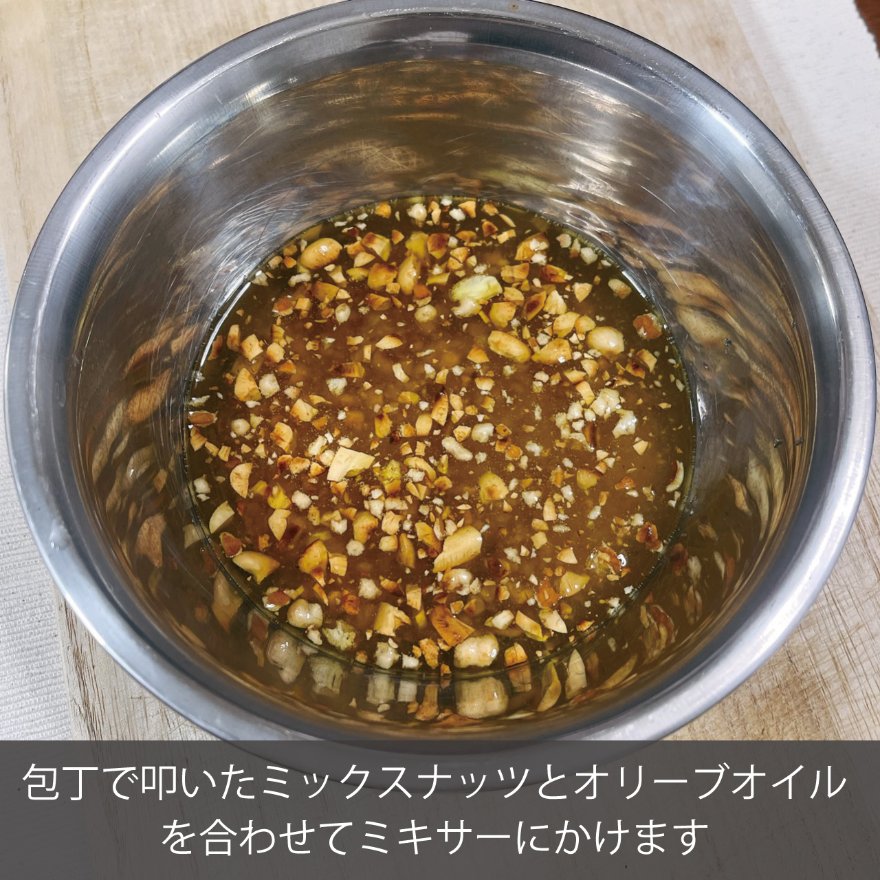 ③煎ったナッツとオリーブオイルをミキサーにかけ、ナッツオイルを作り冷蔵庫で冷やす。
