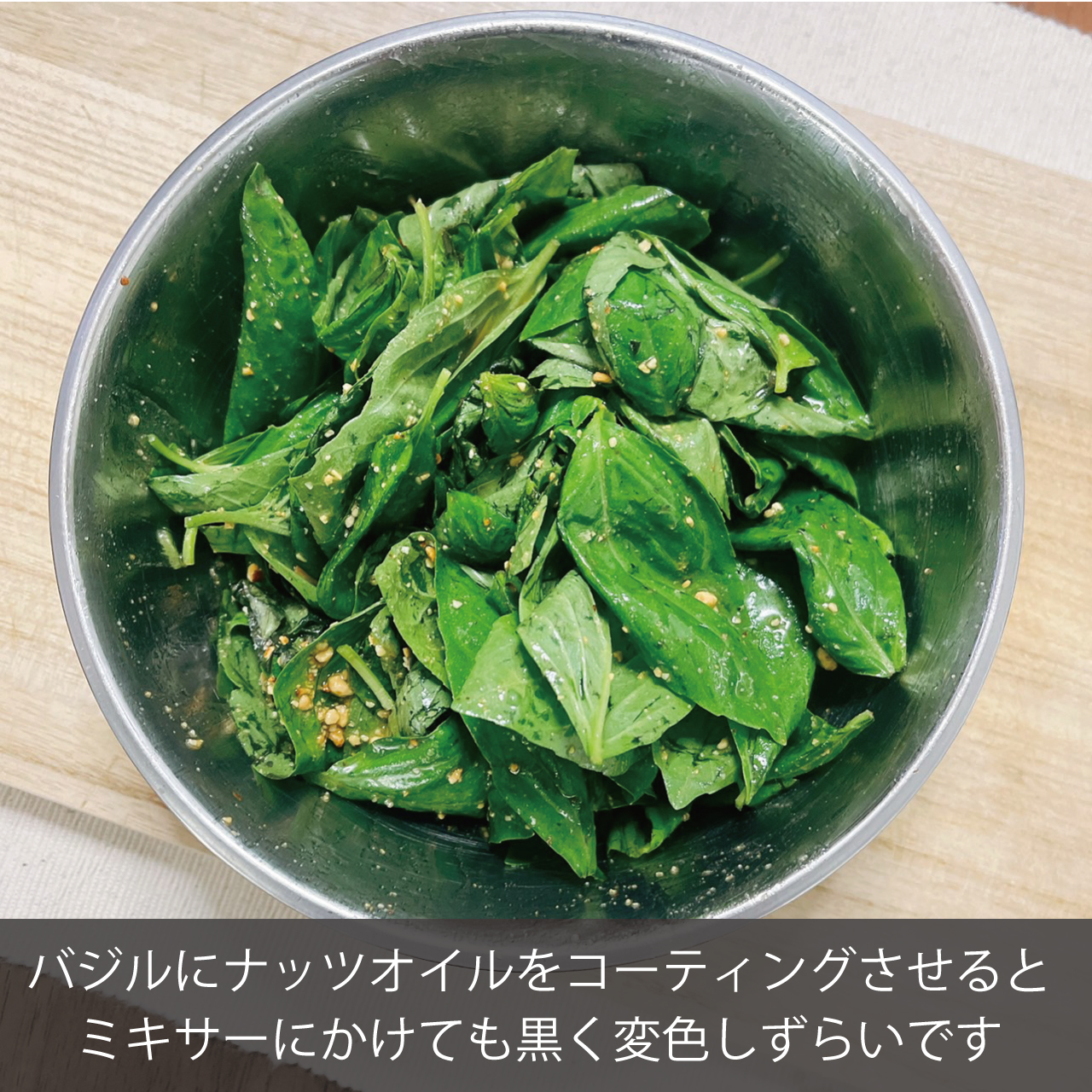 ⑤ナッツオイルバジルをミキサーにかけて完成(ミキサーを回しすぎると、熱でバジルが痛むので適度に)