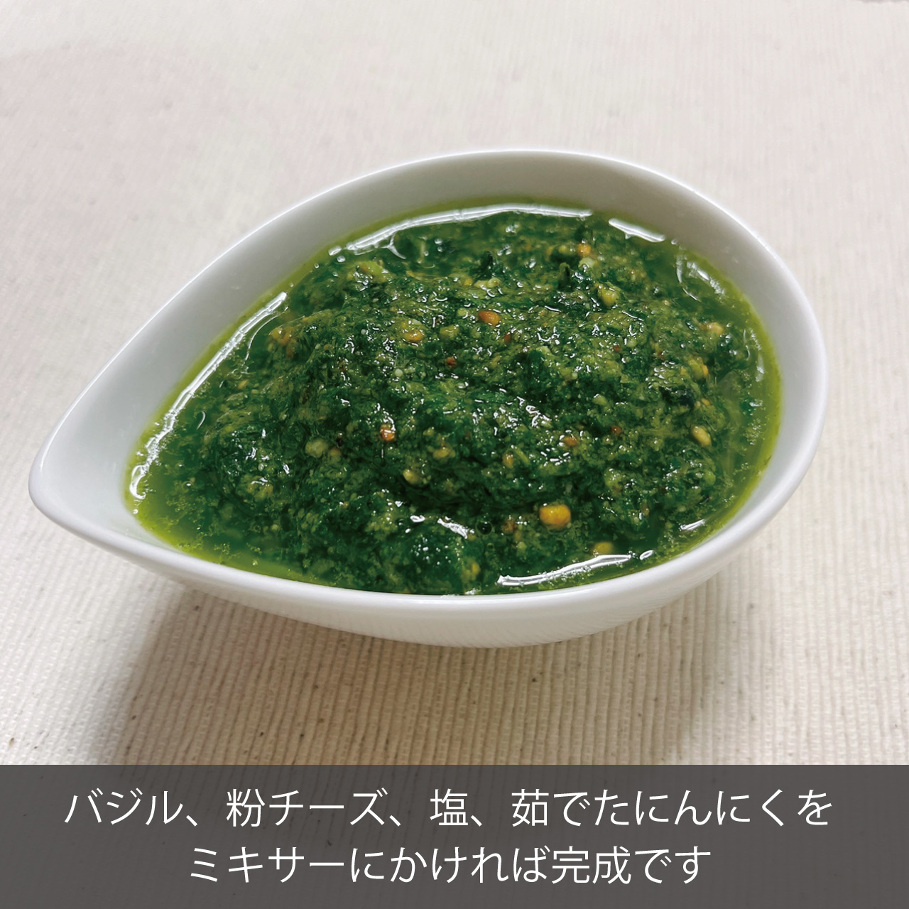 ①バジルは熱を加えると香りが飛び、黒く変色する。材料と機材は冷やしておく。
