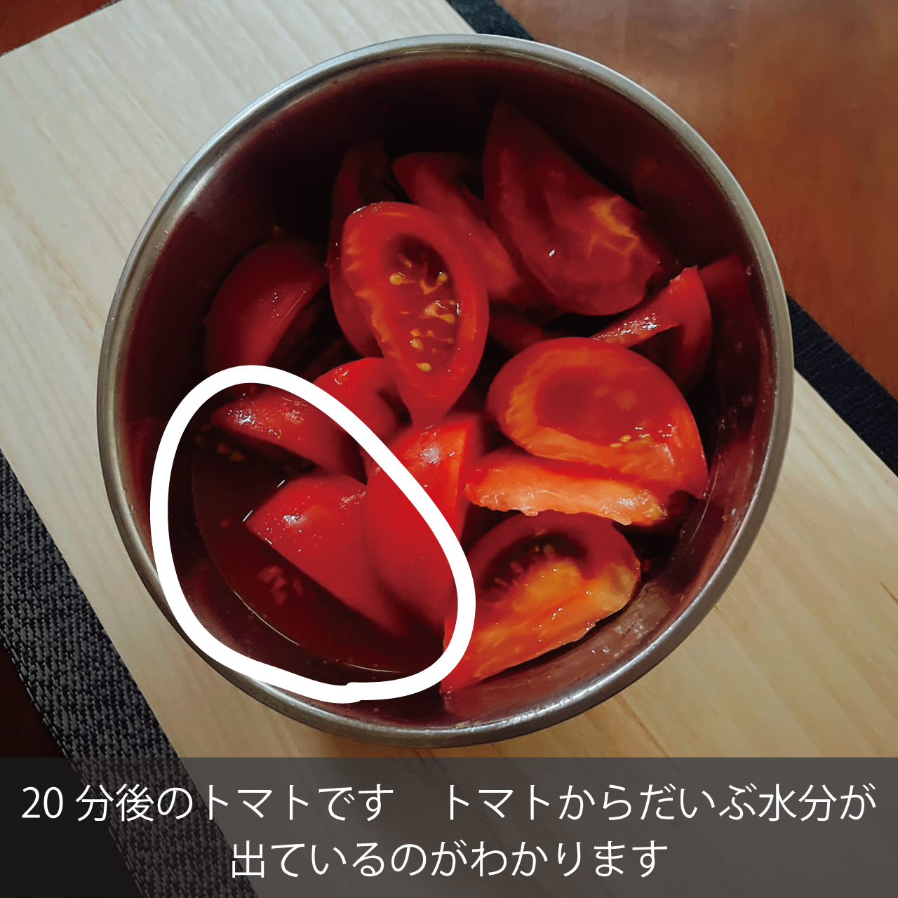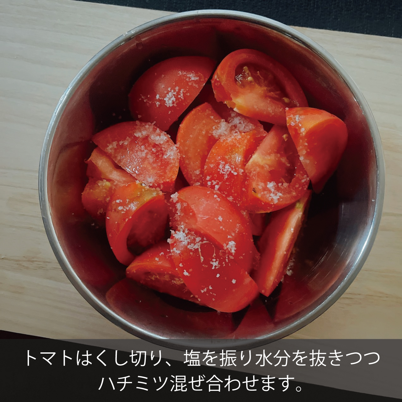 ①塩をふりトマトの余計な水分をしっかり抜き、はちみつの自然な甘さをプラスする。