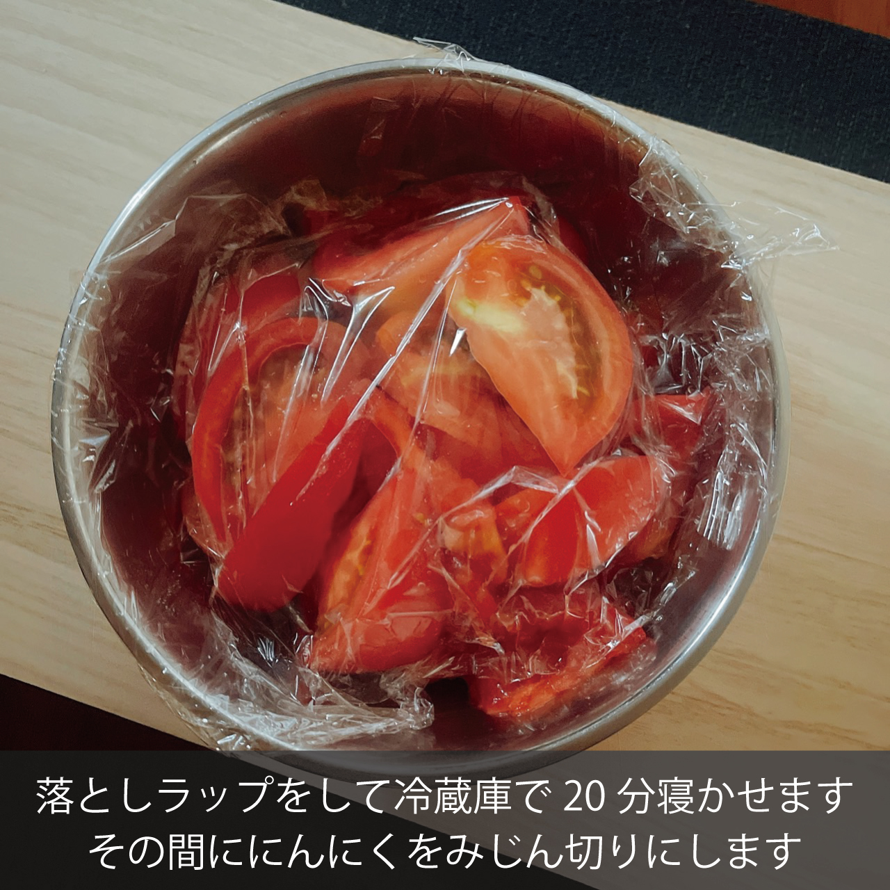 ①トマトをくし切りにして、塩2.5gを振りよく混ぜ合わせます。