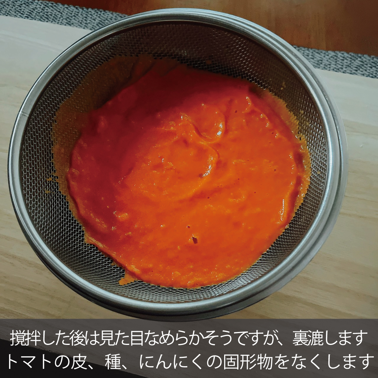 ⑧最後にザル等で裏漉しをして、種やトマトの皮などの口に残る物を除去します。この仕上げの裏漉しもさらになめらかになります。【ここかなり重要】です。