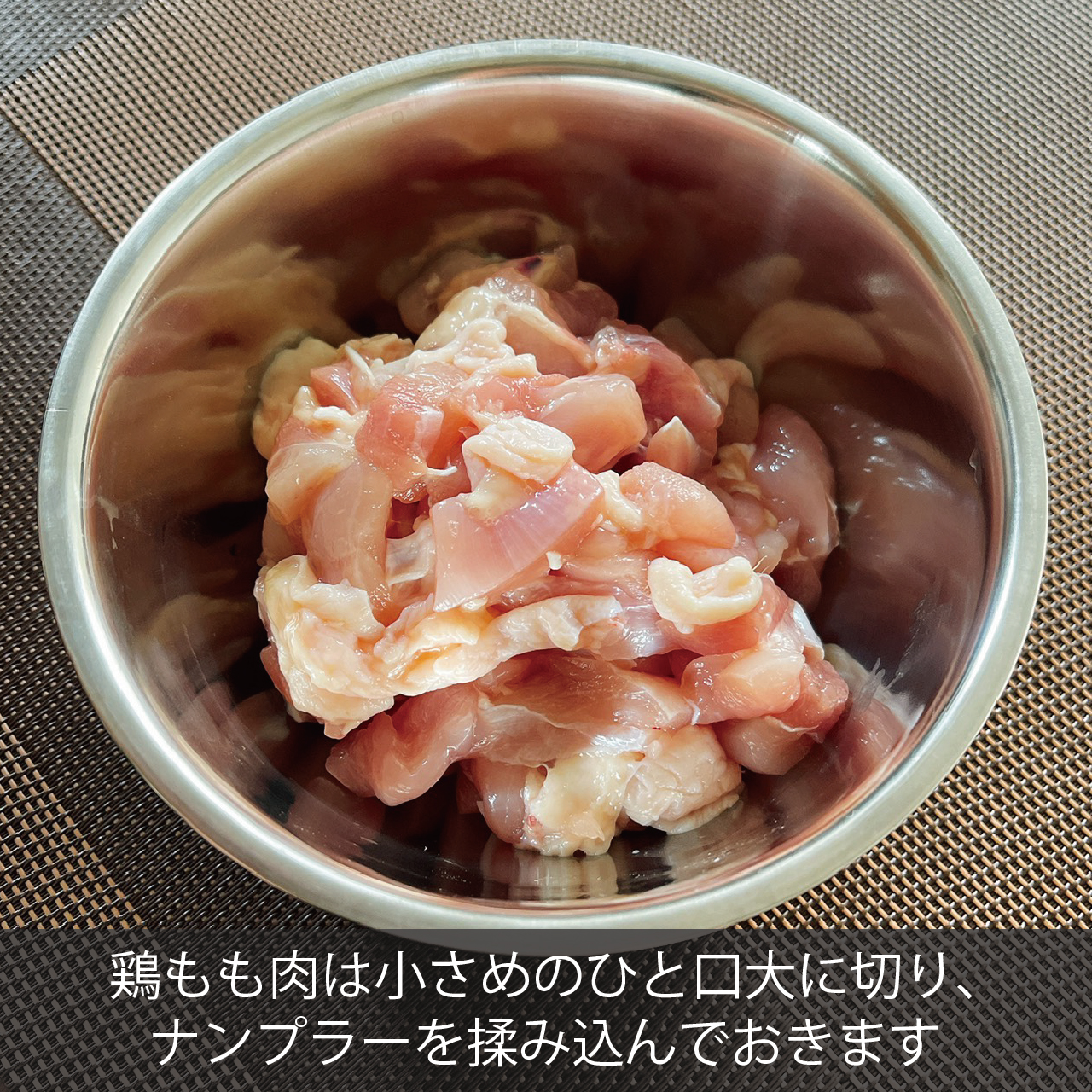 ❶鶏もも肉の用意-もも肉を一口大の大きさに切り、ナンプラ小さじ1を揉み込んでおく