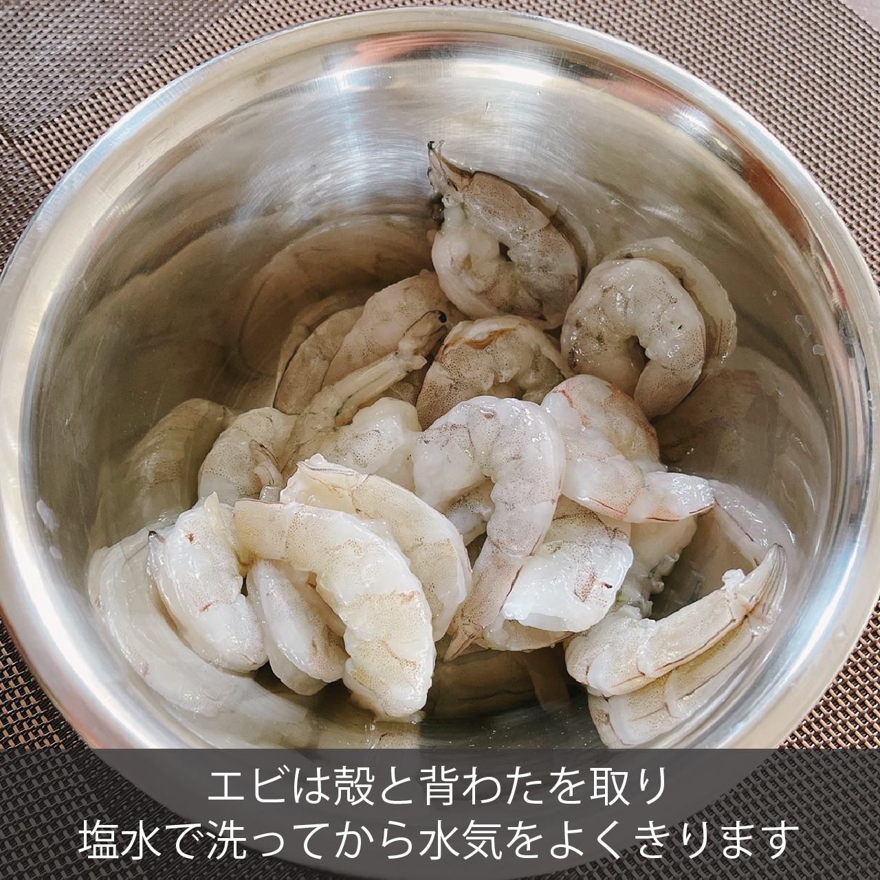 ❷エビの用意-殻をむき、背わたをとり、塩水で洗った後に水をしっかりときり、粗みじん切りにして、酒を揉み込むんでおく(塩水の基本は水500mlに大さじ1の塩で3%の塩水。量をへらす場合は半分の水250mlに塩小さじ1.5でもOK)