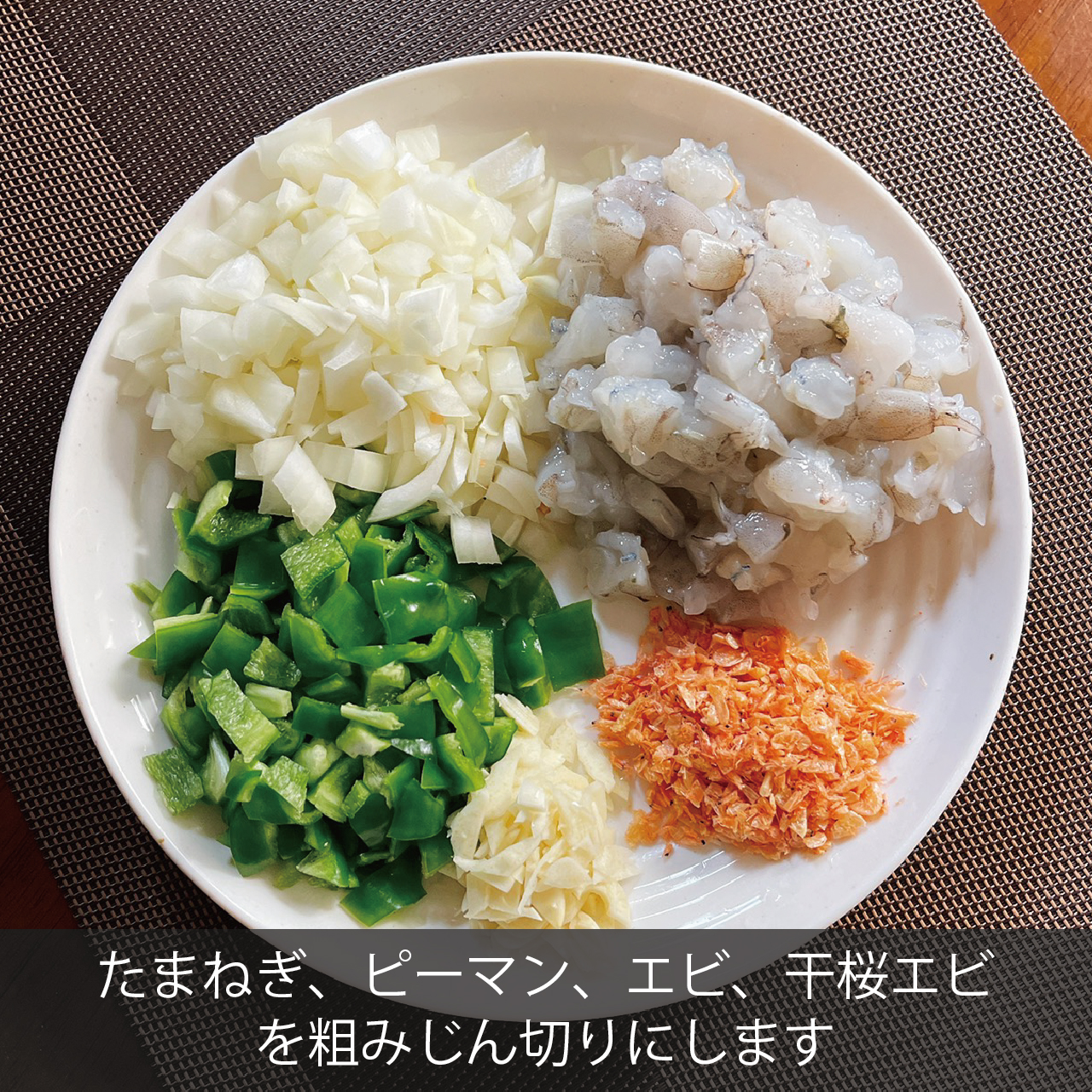 ❸野菜の用意 ピーマンはヘタと種を取り除き粗みじん切りに、玉ねぎ、干し桜エビも同様に粗みじん切りにする。