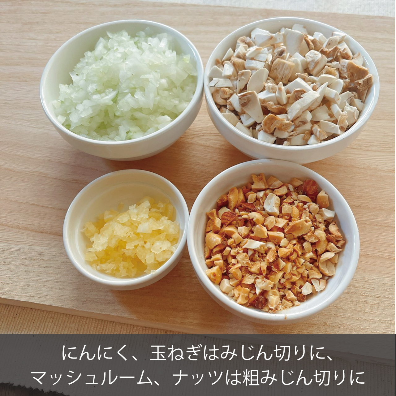 ①玉ねぎ、にんにく、マッシュルーム、ミックスナッツをみじん切りにする。