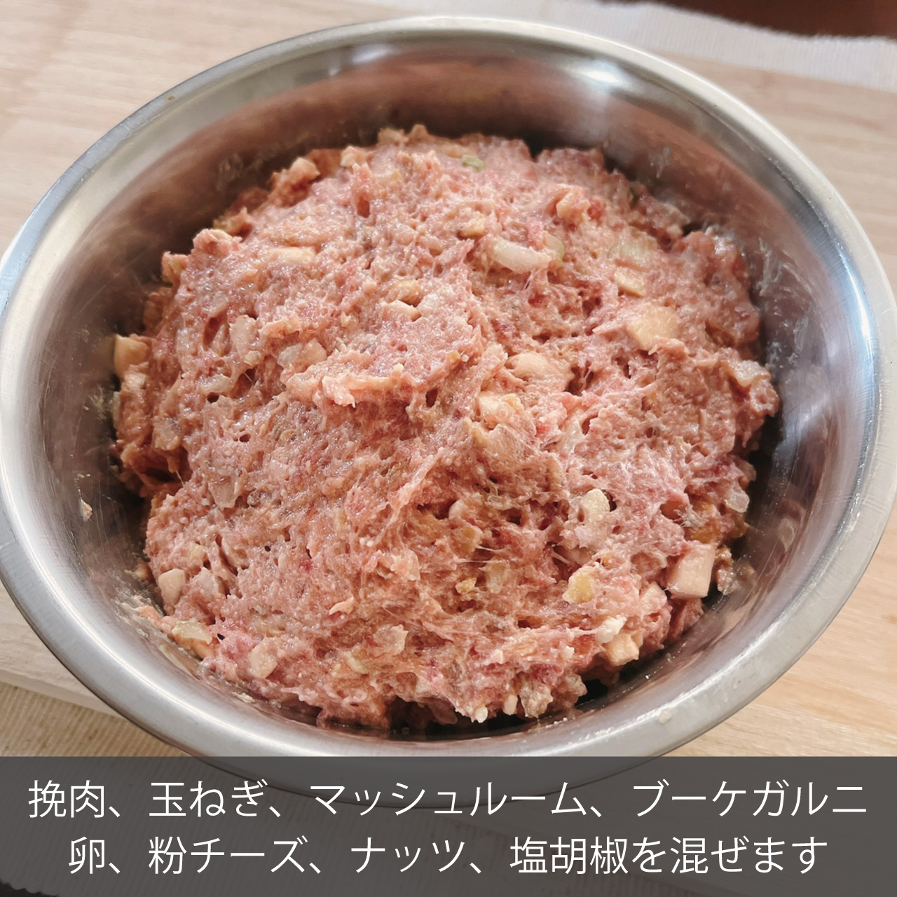 挽肉、玉ねぎだとハンバーグのような食感になりますが、マッシュルームとナッツを入れる事により食感にアクセントがプラスされます。