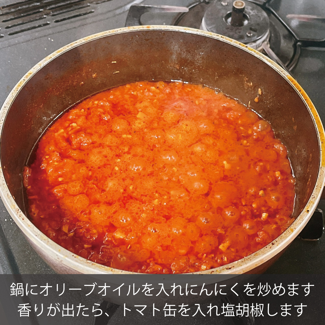 ④フライパンにオリーブオイルを入れ、にんにくを炒めます。にんにくの香りが出たらカットトマト缶を入れ弱火にします。トマトを入れる際は手でさらに潰していれると火が通りやすくなります