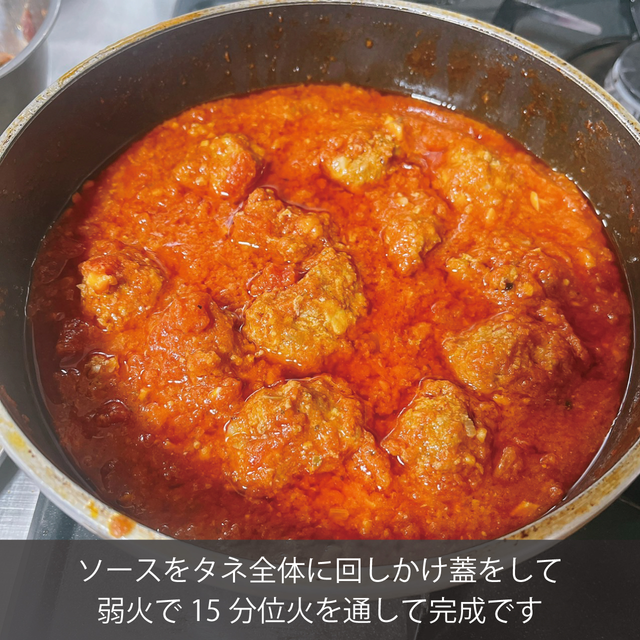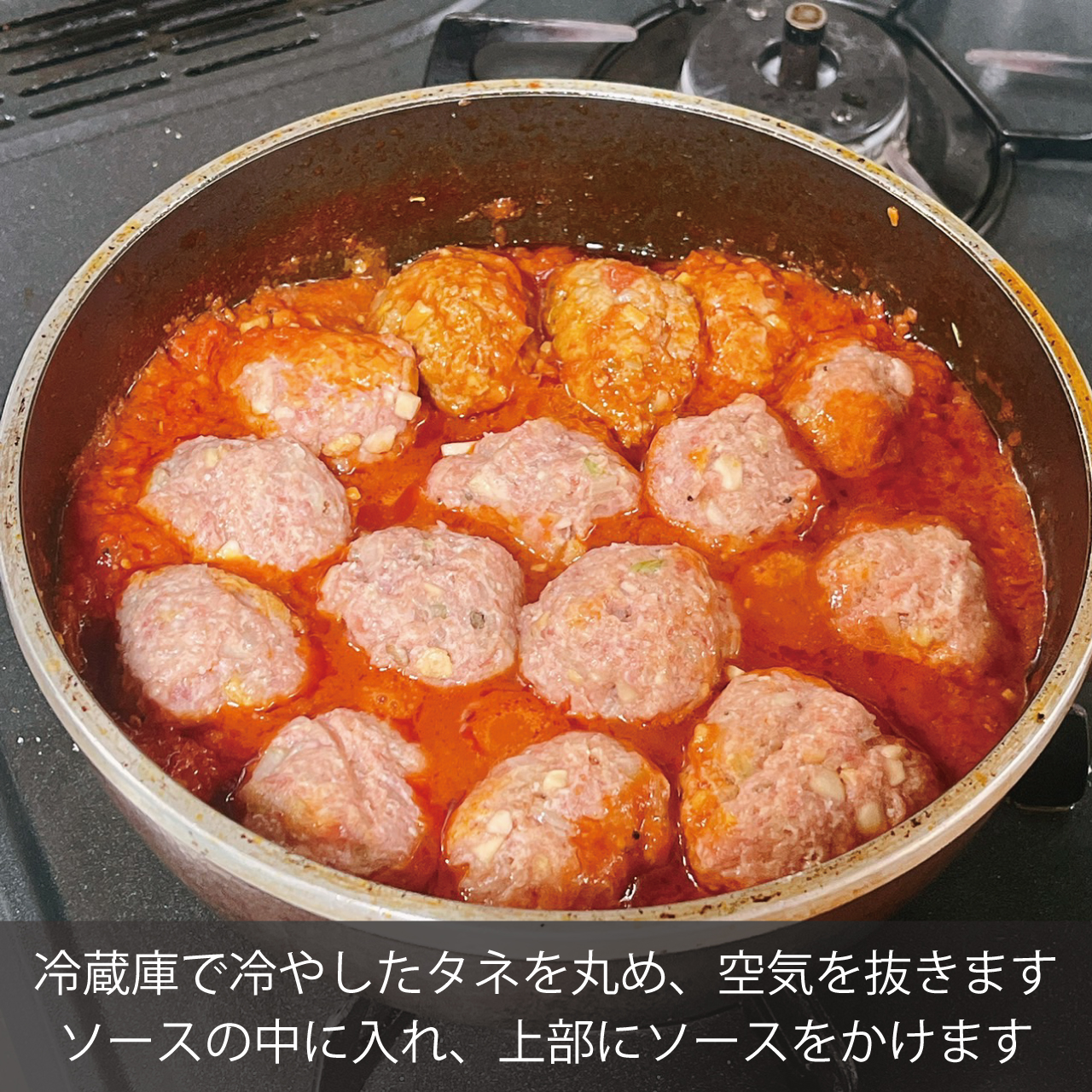 ⑥タネが全部成形できたらソースの中へ入れてきます。タネの上部にもソースを回しかけてタネ全体にソースが行き渡るようにします。蓋をして弱火で15分位火を通したら完成です。
