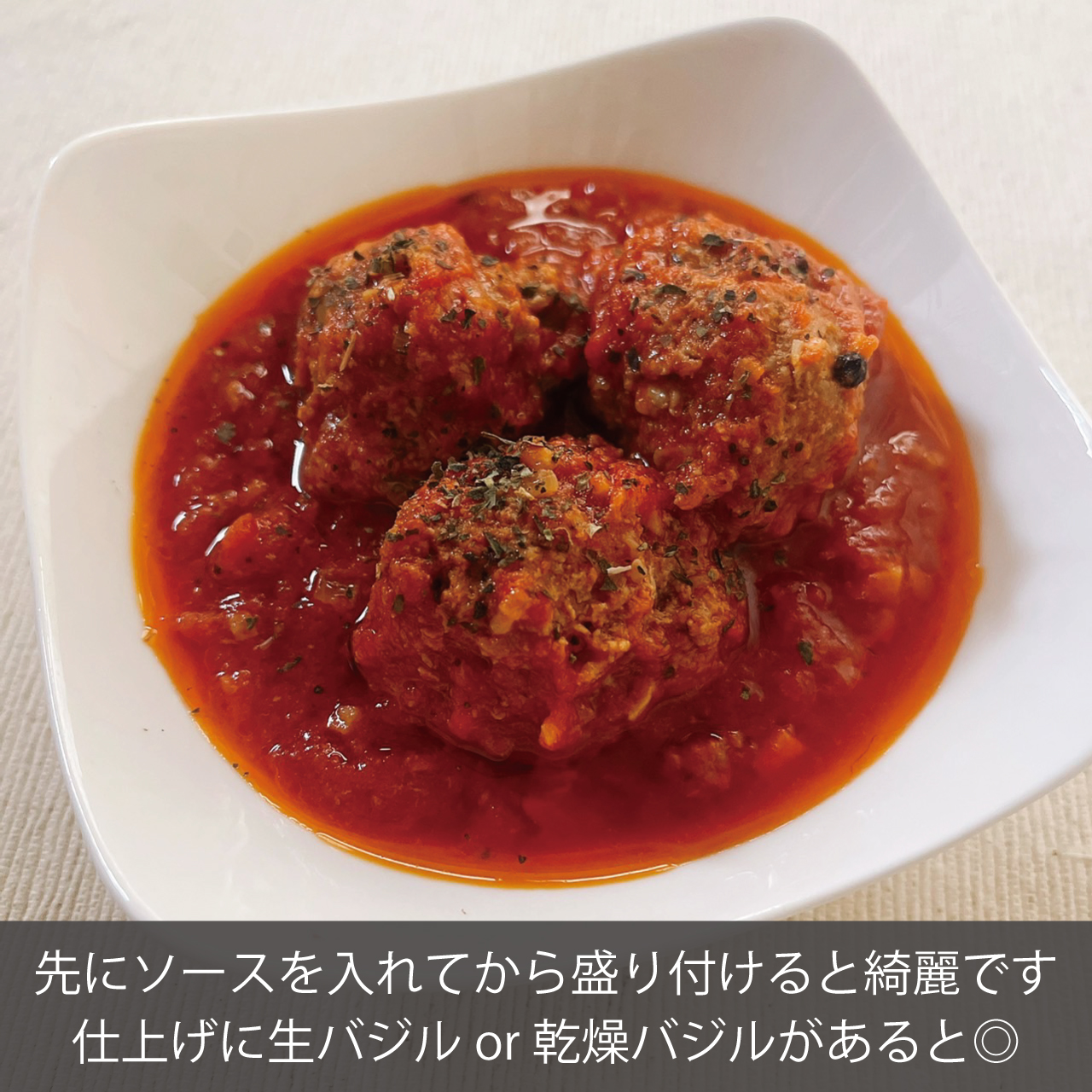 ⑦盛り付けはお皿にソースを先に入れ、その上にミートボールを置くように盛ります。最後にバジルがあればバジルを入れ完成です。