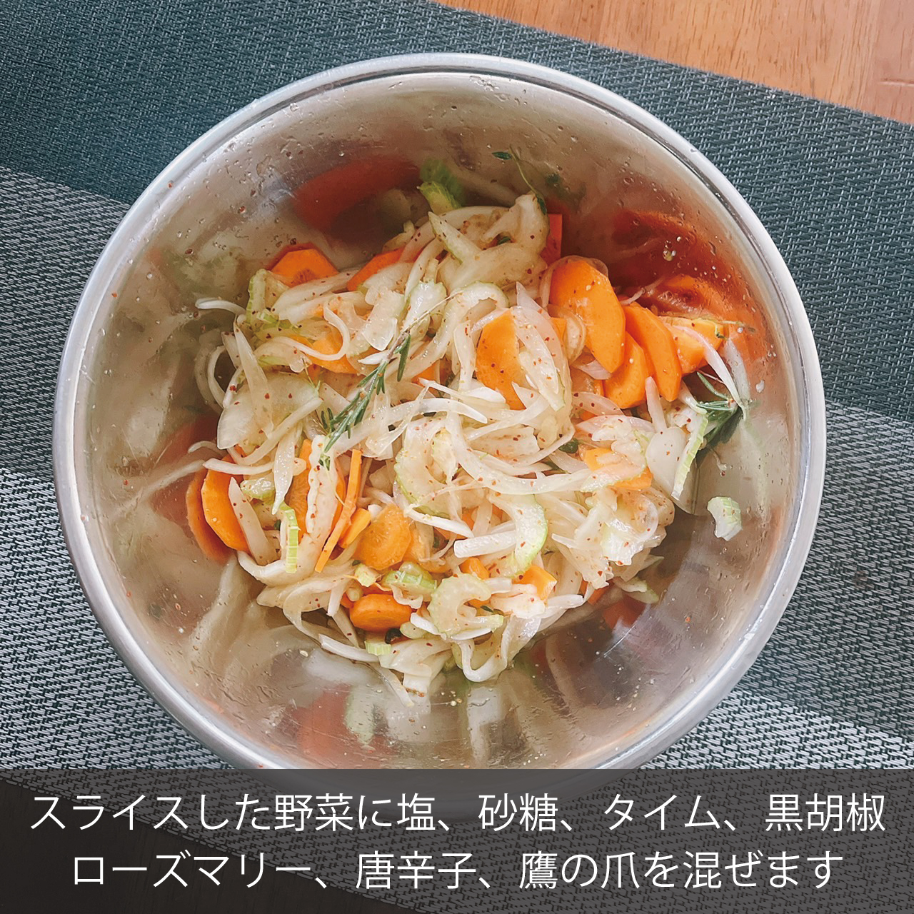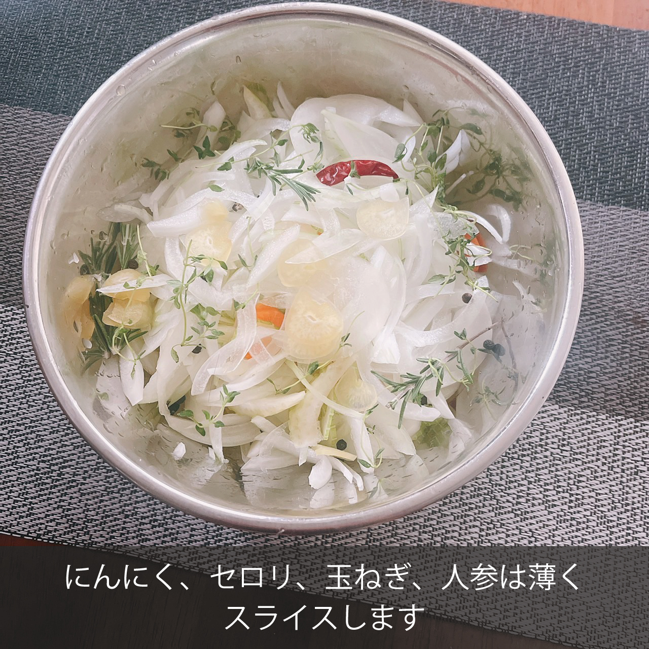 ②玉ねぎ、人参、セロリ、にんにくを薄くスライスする。ボールに塩、砂糖、タイム、ローズマリー、ローレル、黒胡椒、鷹の爪、一味唐辛子とスライスした野菜を入れてよく混ぜあわせます。野菜から水分がしっかり出たらOK