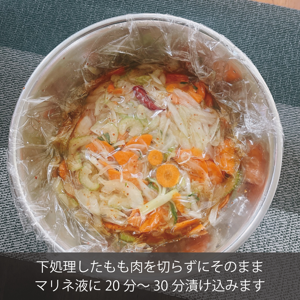 ③マリネ液に鶏もも肉を漬ける(20分~30分)30分を超えるとかなりしょっぱくなるので注意。