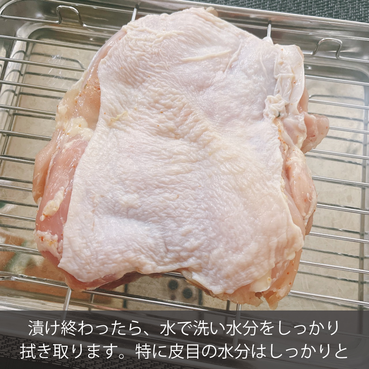 ④漬けた肉を水で洗い(マリネ液が強いのでしっかり落とす)皮面の水分をしっかりキッチンペーパーで拭き取る。拭き取りが甘いと焼き目のパリパリ感に影響が出るで皮目の水分はしっかりとってください。