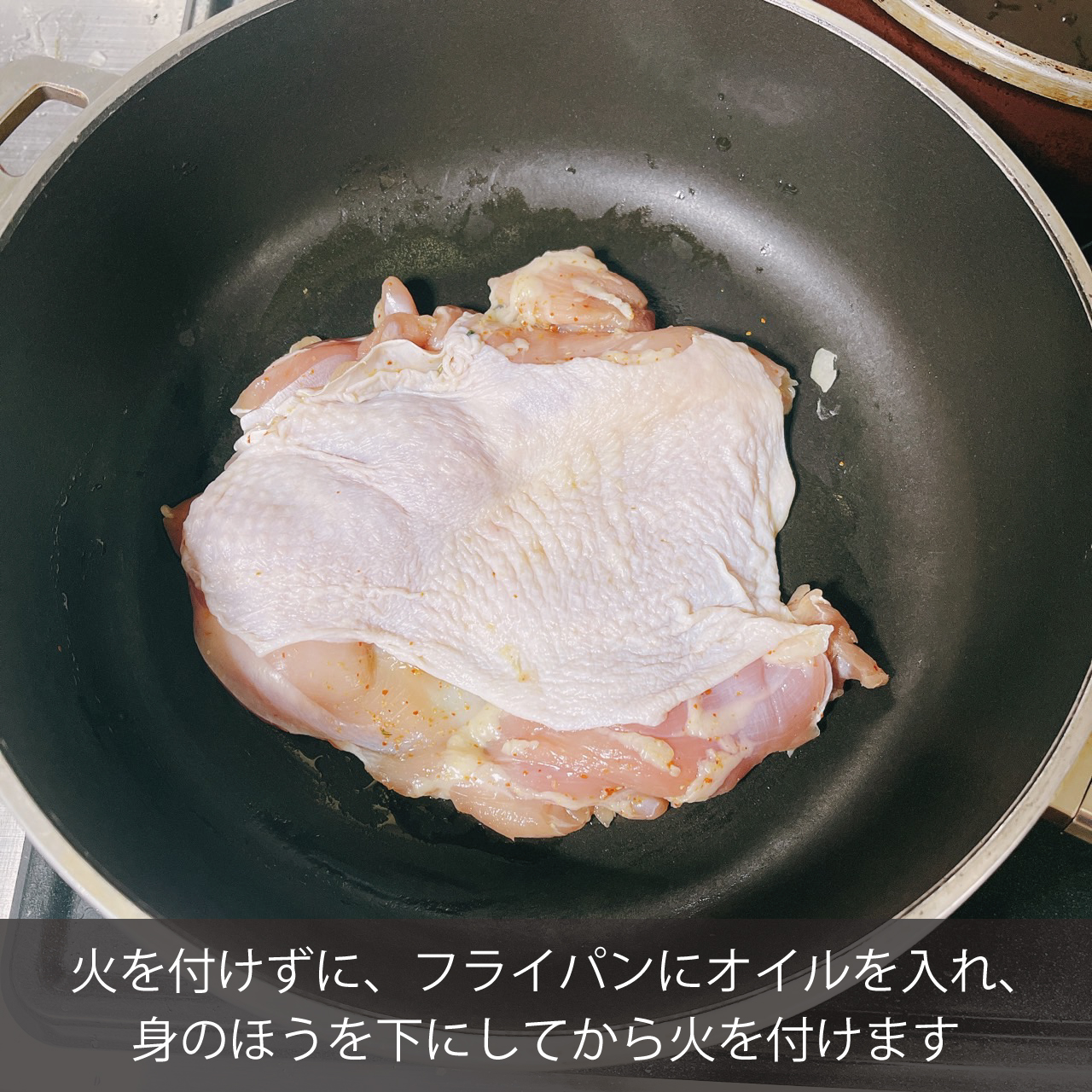 ③鶏肉を焼く時はフライパンを熱しないで、冷めた状態からオイルと肉を入れて焼き始めると、肉が縮みずらい。
