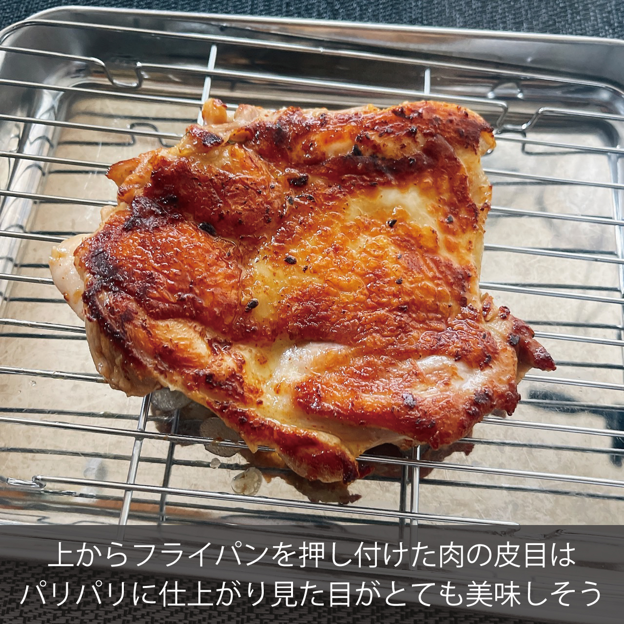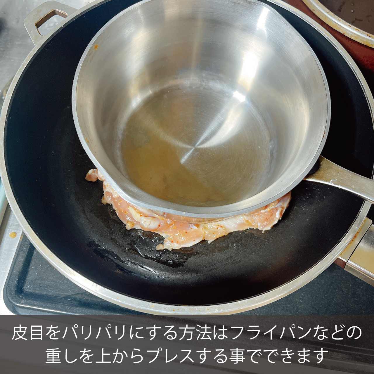 鶏肉の上に重しを載せて、皮目をフライパンに均一に接地させる事でむらなく焼目が付きます。