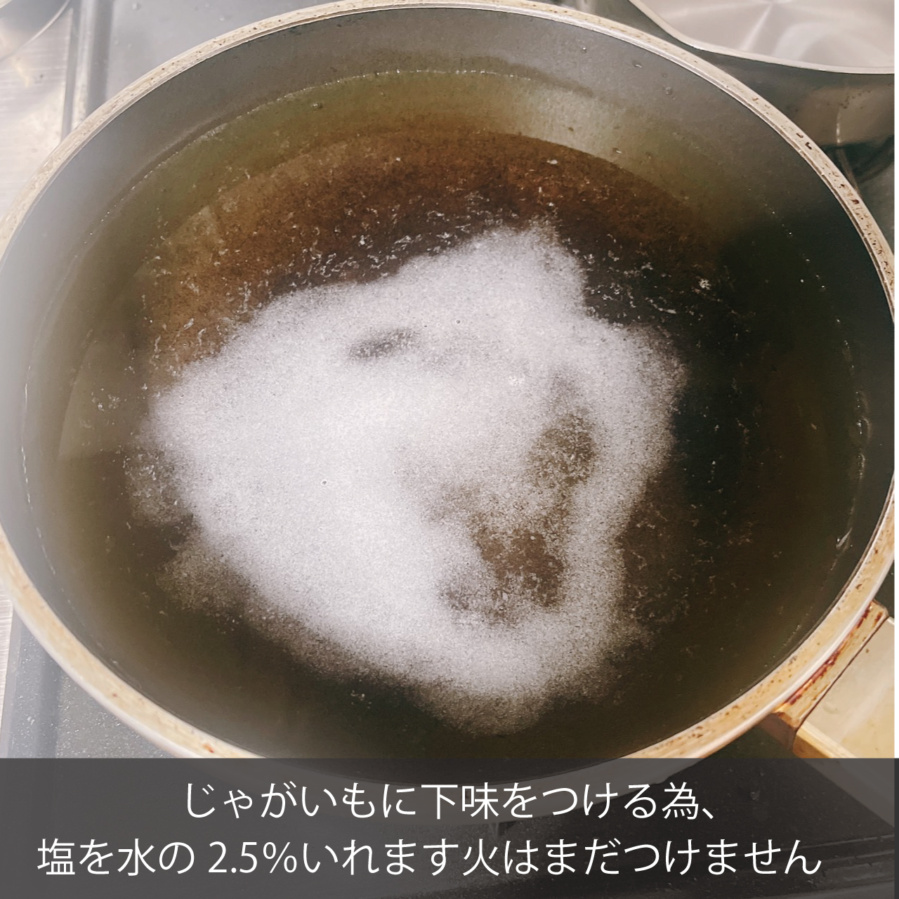 ①じゃがいもをよく洗って泥を落とします。水に対して2.5%の塩水を作り、水が冷たい状態からじゃがいもを入れて火にかけます。水の量はじゃがいもが全部かぶる位の量で。