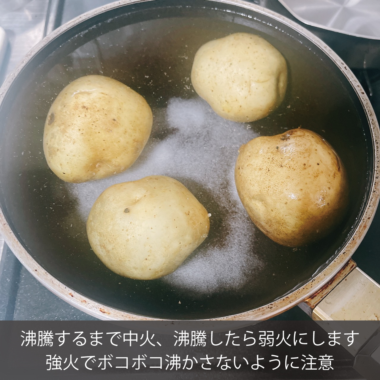 水からゆっくり火を通し、ボコボコ沸騰させないで茹でます。ボコボコ沸騰した状態で茹でるとじゃがいもの中に火が通る前に外側がボロボロになるからです