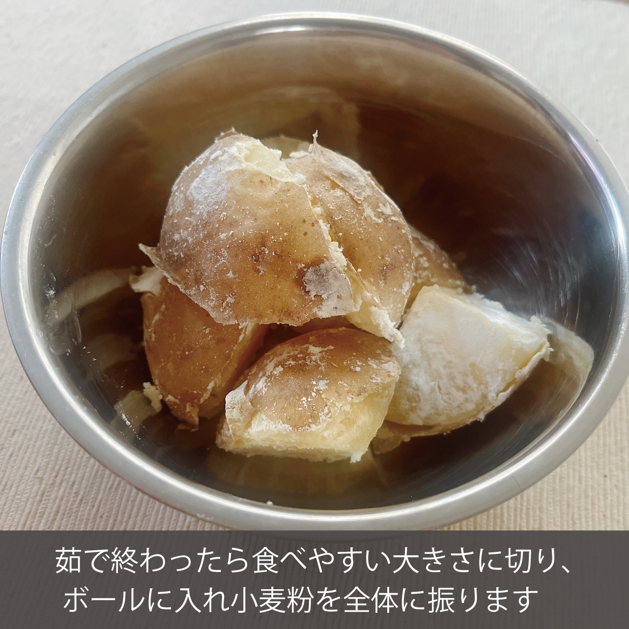 ②切ったじゃがいもをボールに移し、小麦粉を全体にまぶします。この時ボールを動かして小麦粉を回していくとじゃがいもが崩れにくいです。