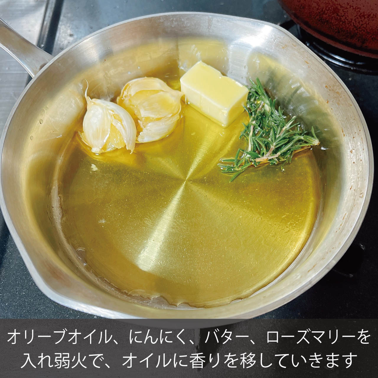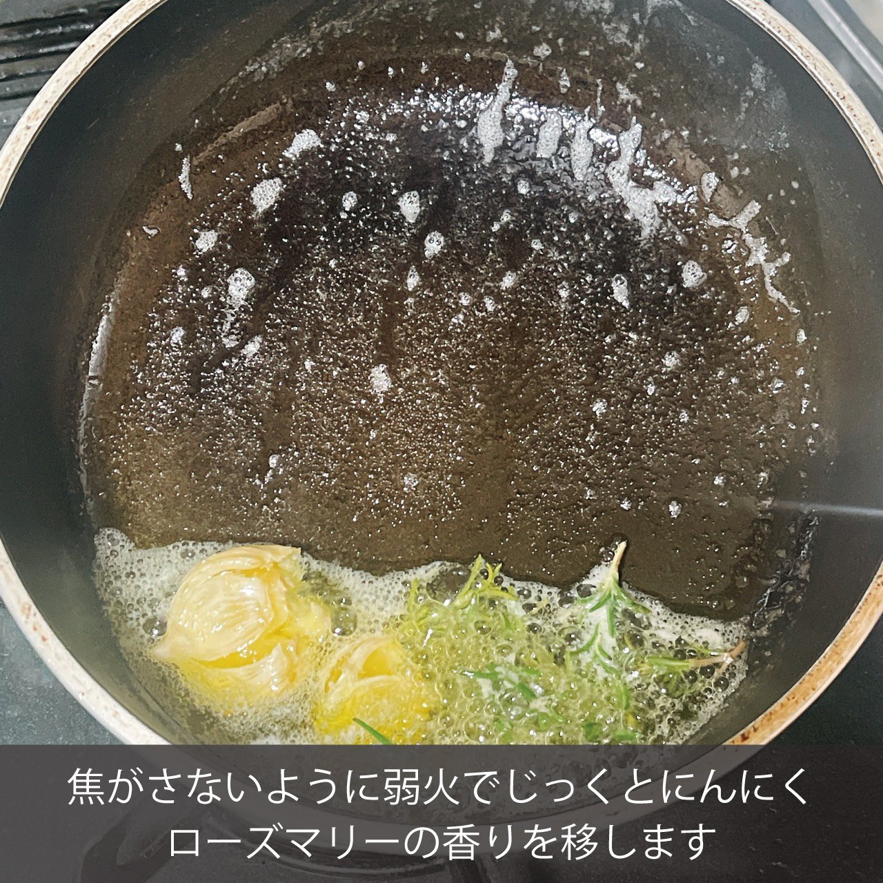 ③フライパンにオリーブオイル大さじ2を入れ、包丁で潰した皮付きにんにく、バター、ローズマリーを入れて弱火でじっくりとオイルに香りを移していきます。香りが十分に出たらじゃがいもをフライパンに入れます。