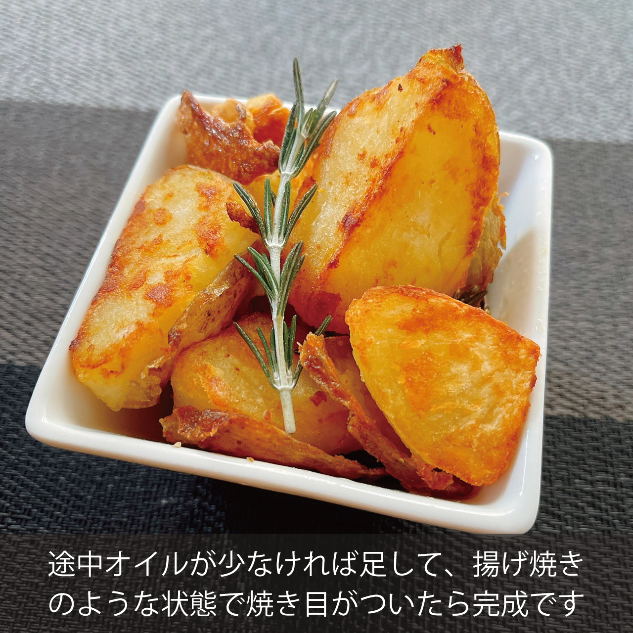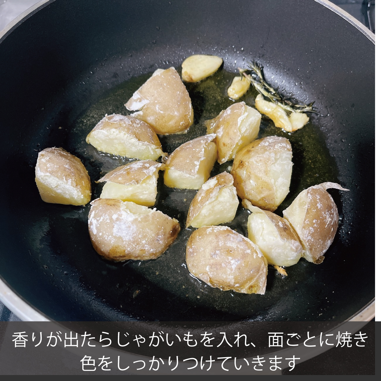 ④じゃがいもを入れたら、火を強火にしじゃがいもにしっかり焼き色をつけます。ローズマリーは強火にした後焦げやすいのでタイミングで出してください。
