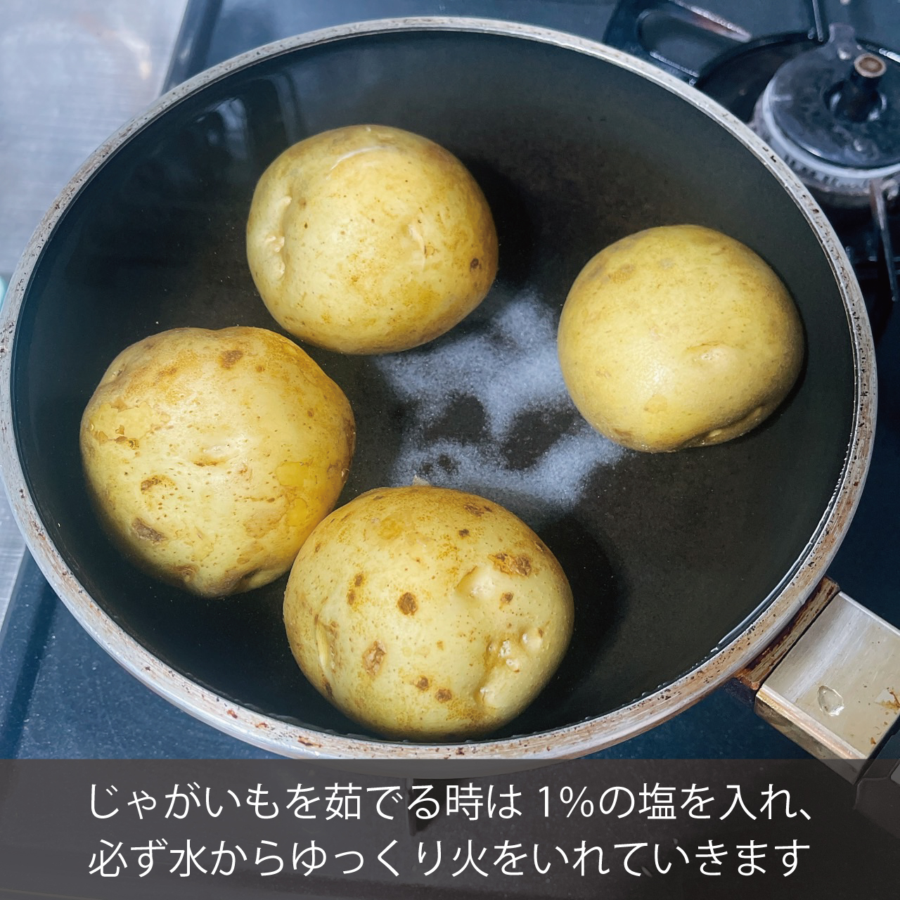 ①じゃがいもは水から茹で、均一に火が入るように弱火で茹でる