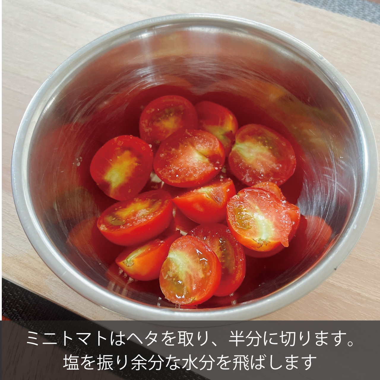 ②ミニトマトを洗い、ヘタを取り半分に切る。軽く塩を振りトマトの余分な水分を抜く。