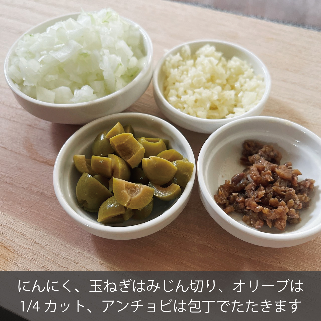 ③にんにくはみじん切りに、玉ねぎは粗みじん切りに、オリーブは1/4サイズに、アンチョビはみじん切りにカットします。