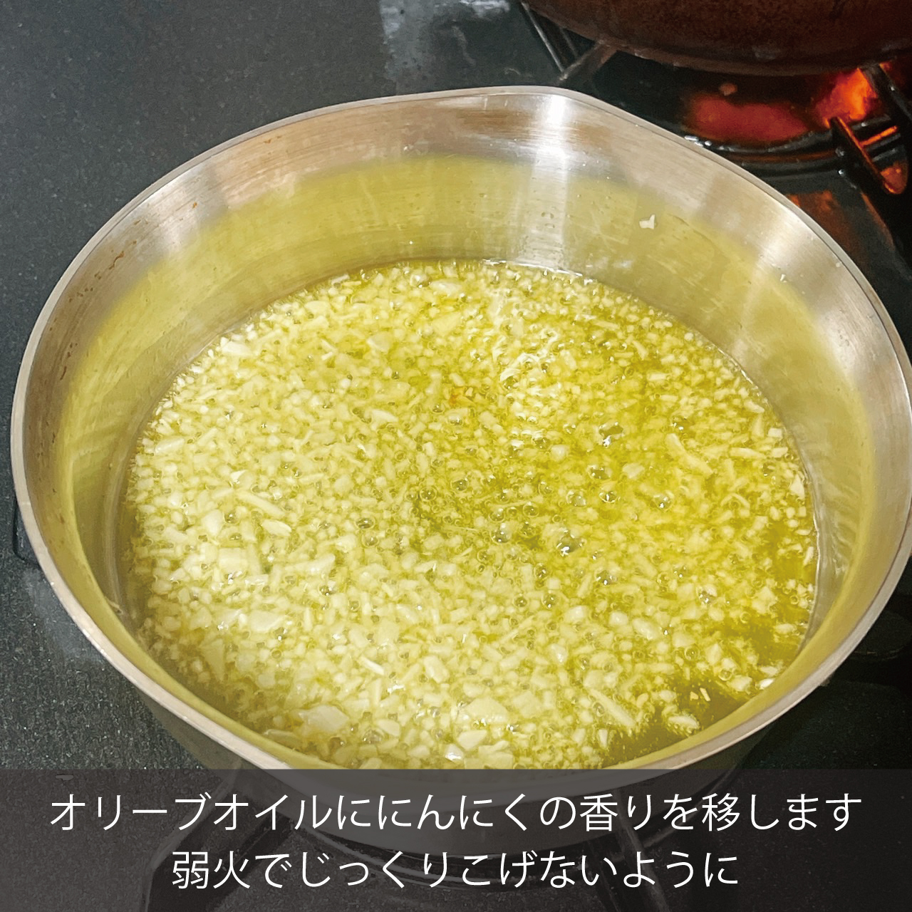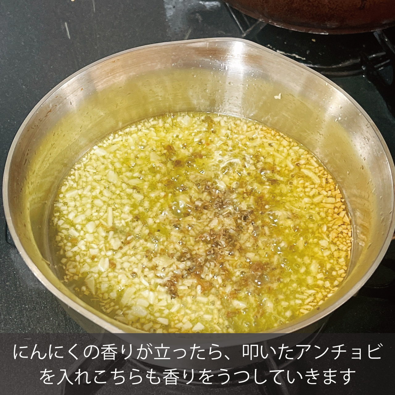 ④オリーブオイルをフライパンに入れ、にんにくを軽く炒めアンチョビを入れます。香りが出たら玉ねぎを入れ塩をして2~3分辛味がとれるまで炒めます。