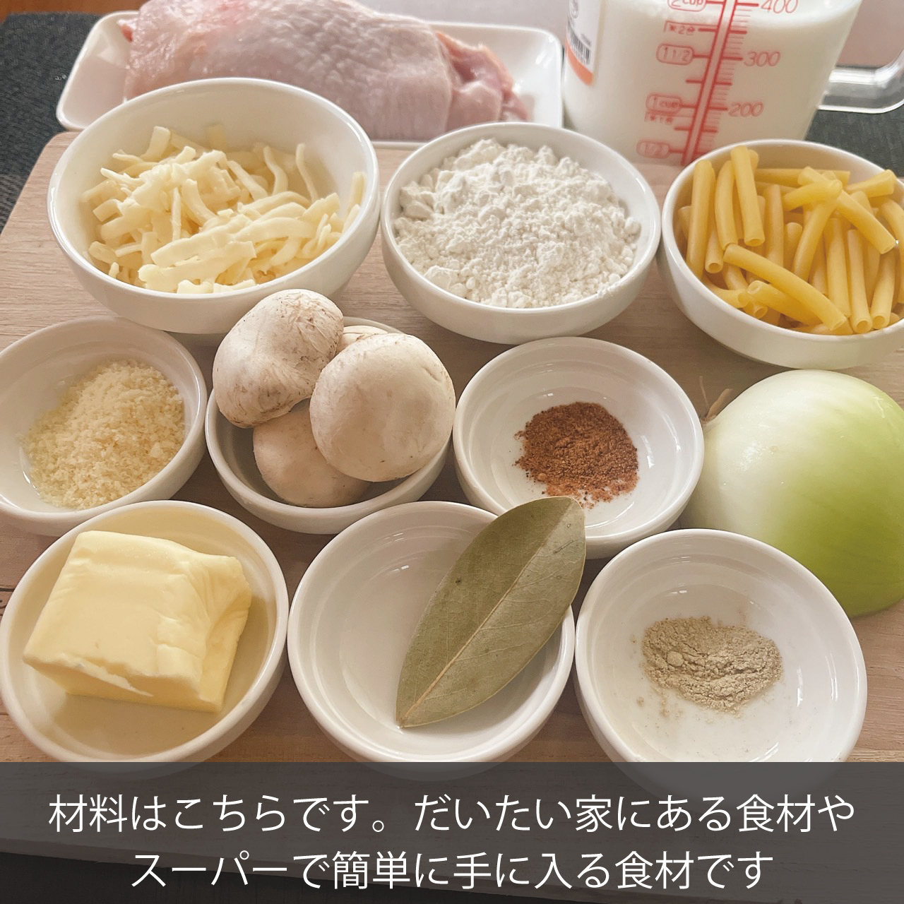 今回はチキンマカロニグラタンですが、チキンの代わりに魚介を入れたりもできるベースのマカロニグラタンの作り方となっています。