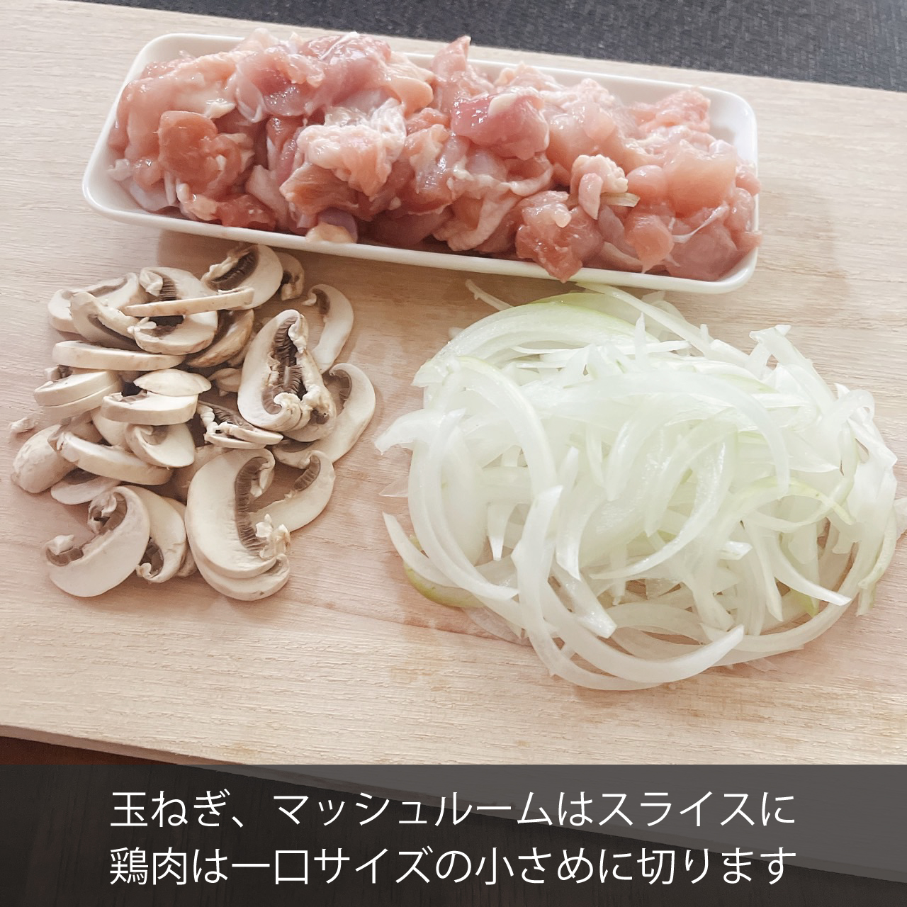 ④鶏肉に火が通ったら玉ねぎをしんなりするまで中火で炒めます。次にマッシュルームを入れ軽く混ぜます。ナツメグ、白ワインを大さじ2入れて香りを出します。