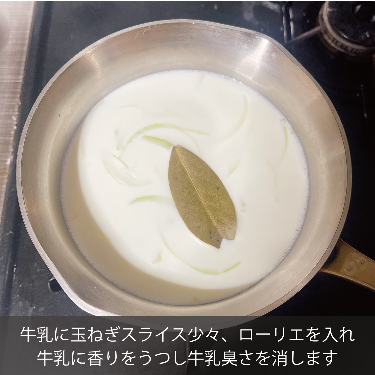 牛乳の臭みを取るために、少量の玉ねぎスライス、ローリエを入れてひと煮立ちさせます。