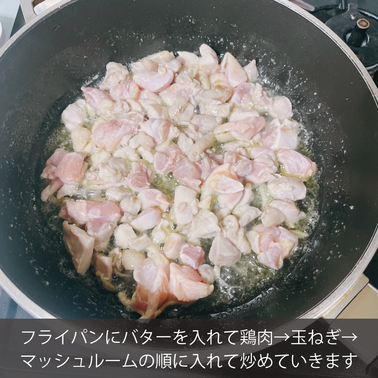 ③フライパンにバターを入れ、中火で鶏肉を炒めます(火を通すだけで焼き目はつけなくてOKです)
