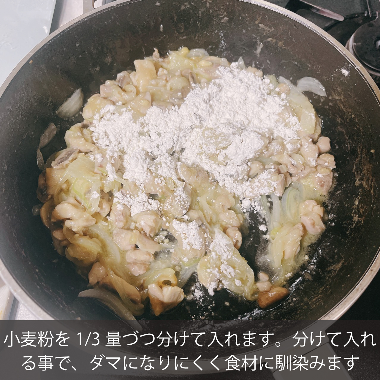 ⑤いよいよここから小麦を入れます。小麦粉は三回に分けて入れていきます。最初に1/3量を具材にふりかけるようにしてかけていきます。具材全体に小麦粉が馴染んだらまた1/3量を入れてを繰り返します。小麦粉を炒める事で粉っぽい感じがなくなります。