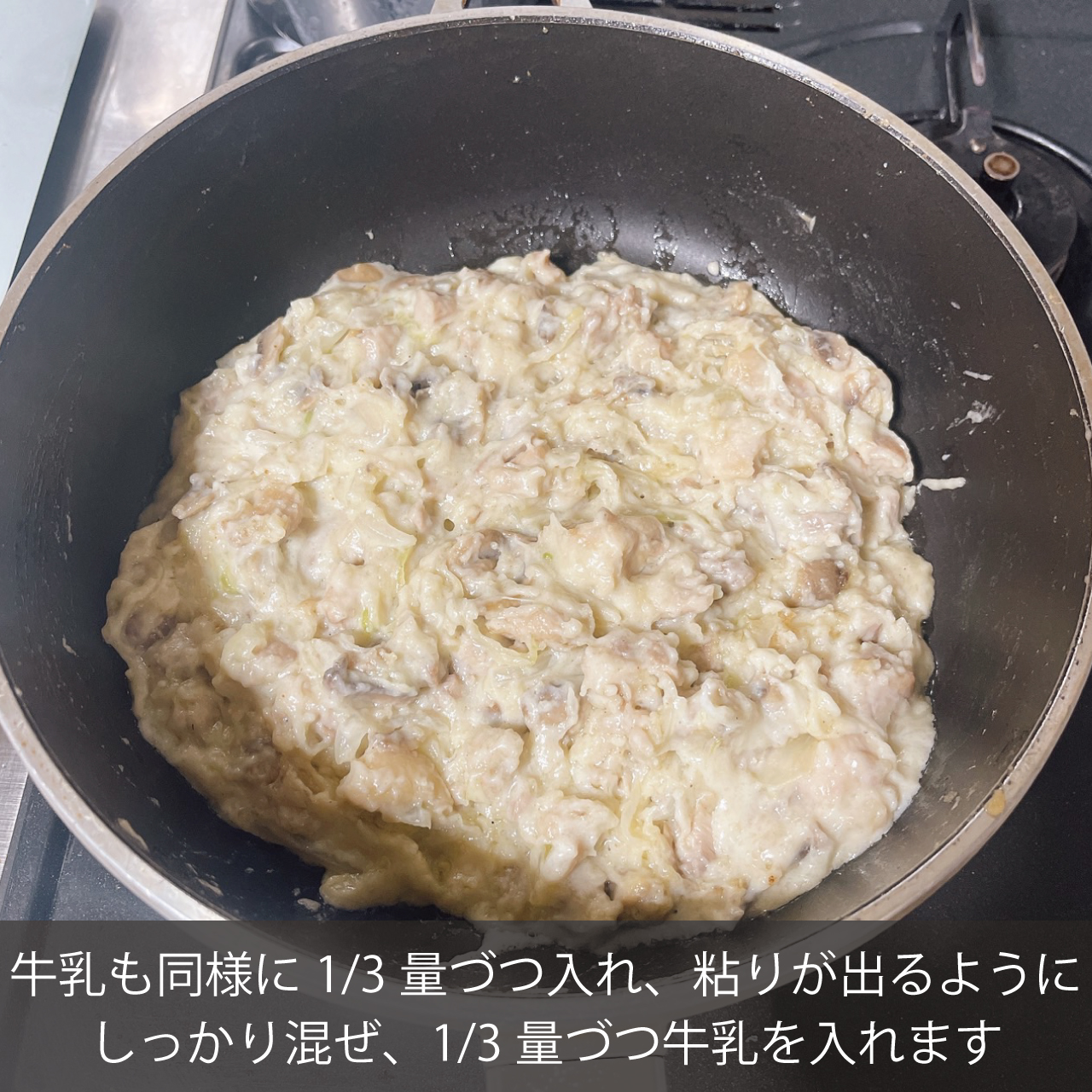 牛乳も全量を一度に入れると、具材に絡まずシャバシャバのソースになります。1/3量づつ3回に分けて入れ、粘り、とろみが出るように具材と牛乳をしっかりとゴリゴリ混ぜ合わせます。