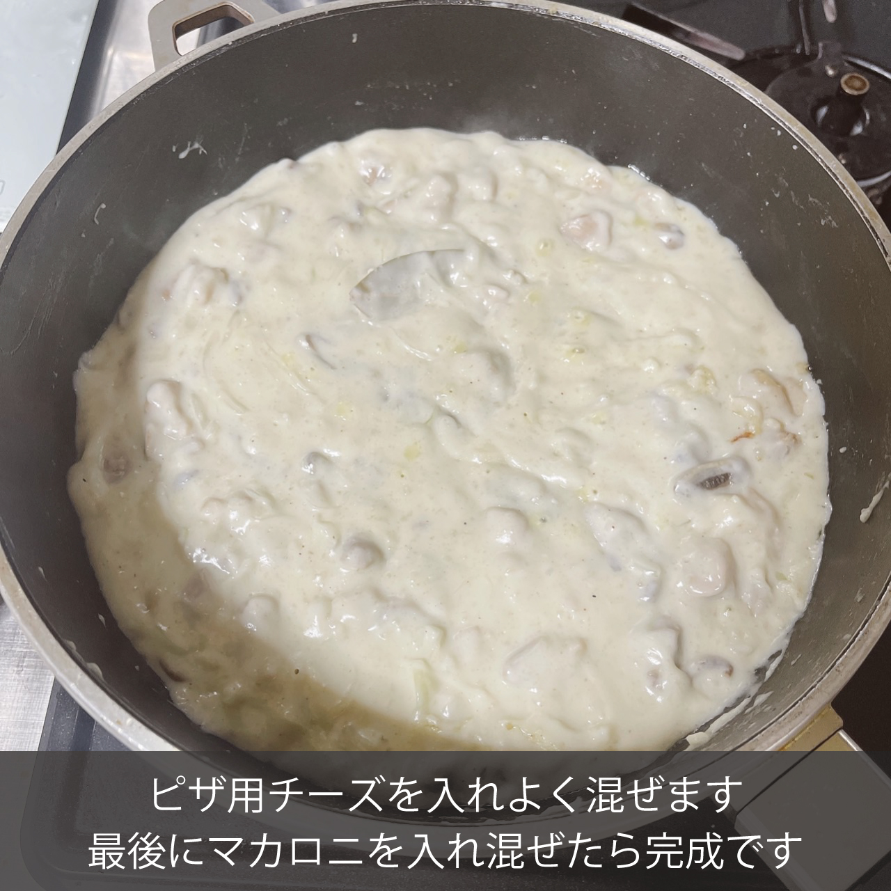 ⑦ピザ用チーズ、マカロニを入れ混ぜ合わせ、塩胡椒をして味を整えます。