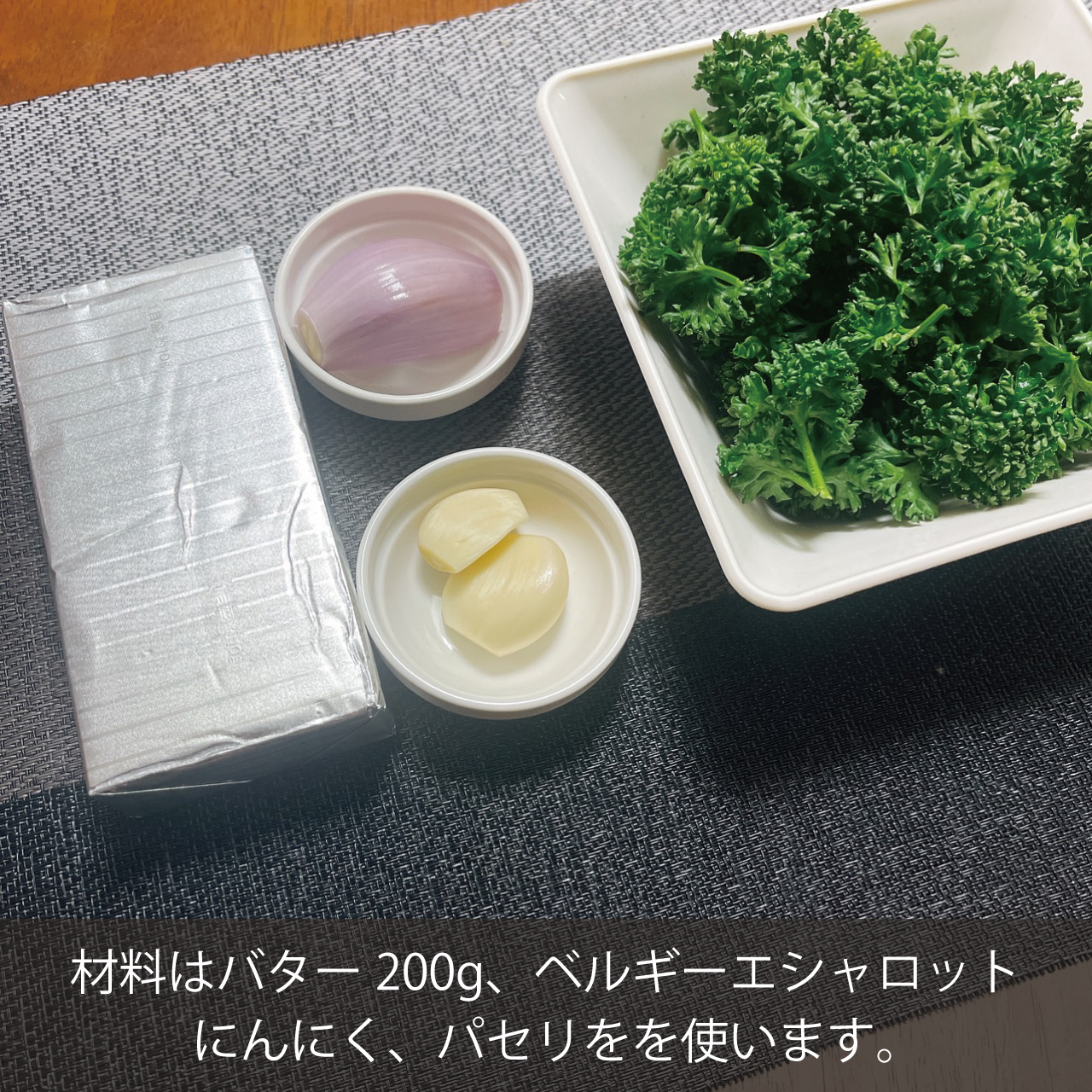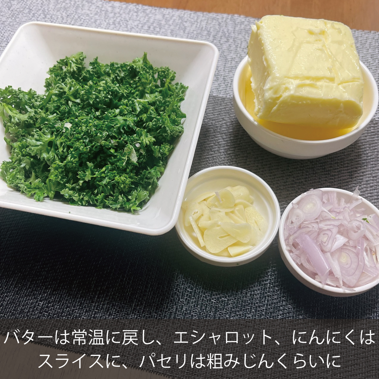 ①パセリ、にんにく、ベルギーエシャロットをみじん切りにします。