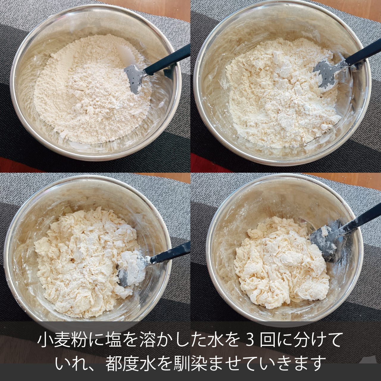 ①水に塩を入れ混ぜます。強力粉、薄力粉、ドライイーストを混ぜ合わせ 塩を溶かした水を1/3量づつ入れ、粉に水を合わせます。