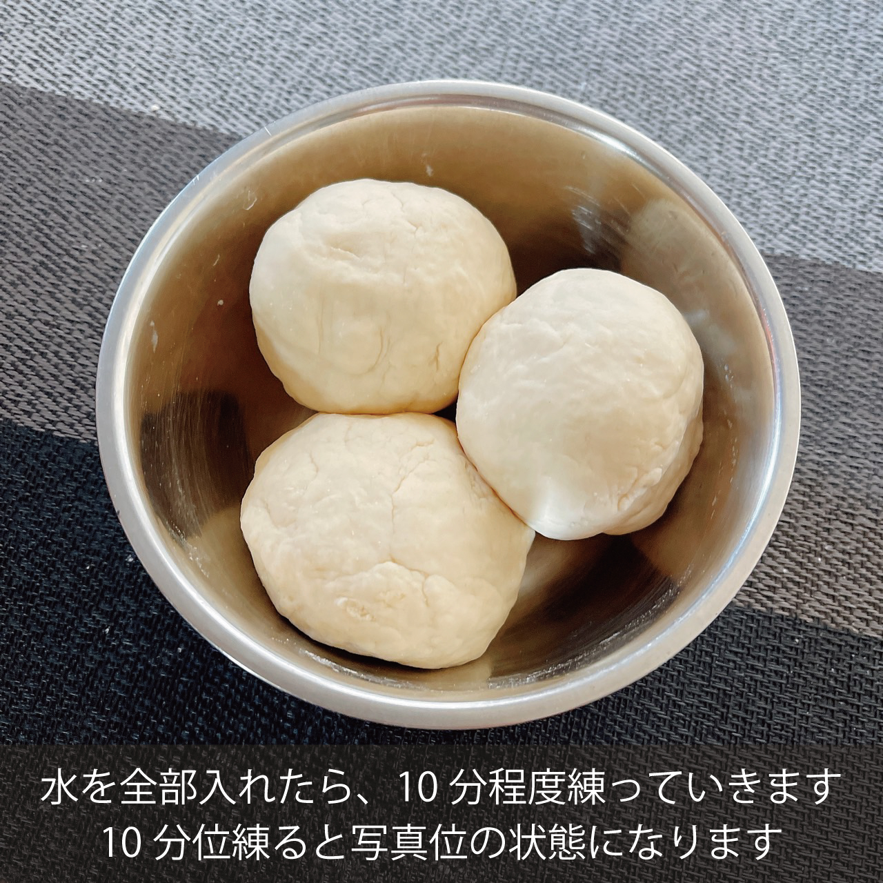 ②1/3量の水2回目、1/3量の水3回目まで入れたら10分程こねて3つに分けます。丸く整形しボールやタッパーなどにいれ一晩~半日程度冷蔵庫で発酵させます。