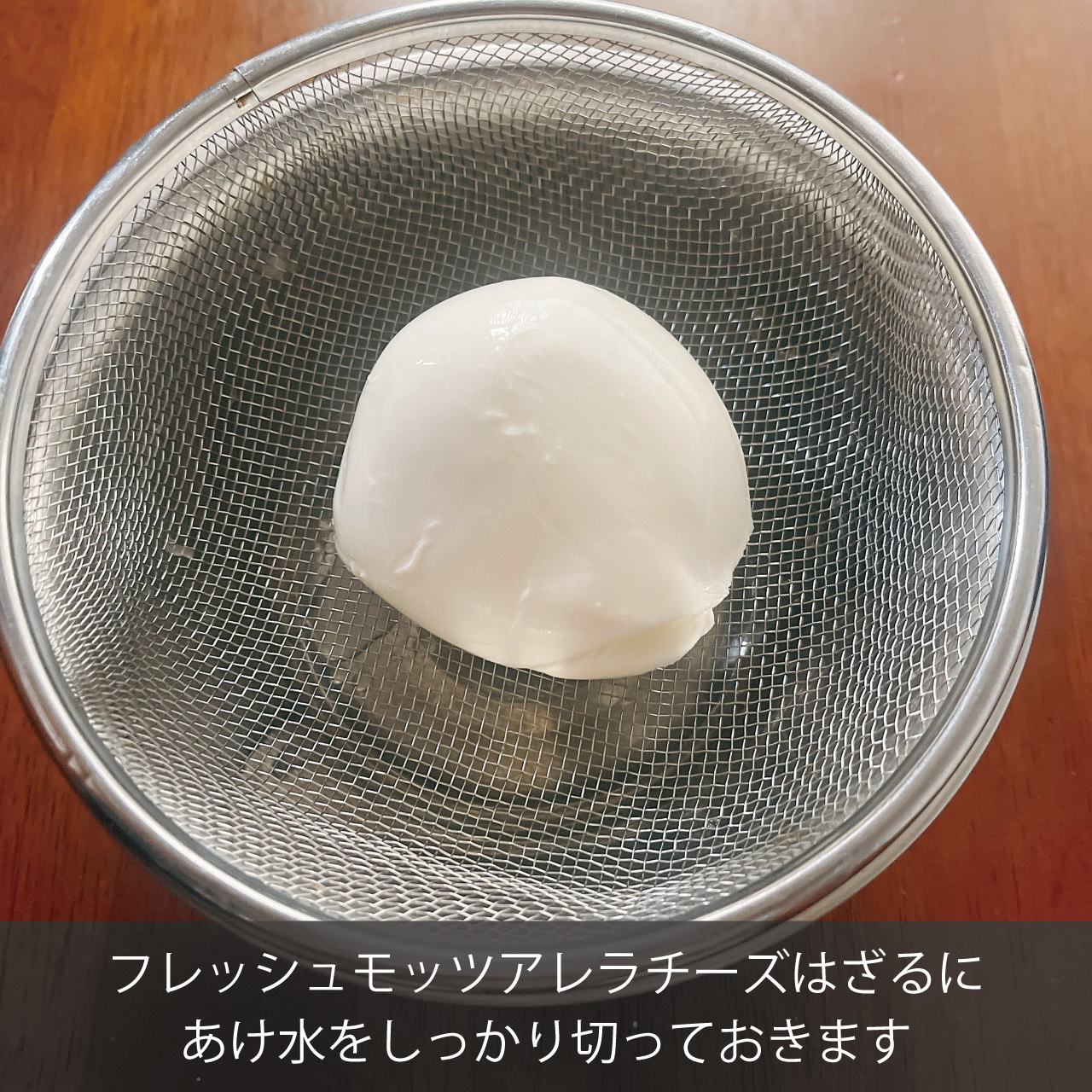①フレッシュモッツアレラチーズはザルに出し、水分を切る