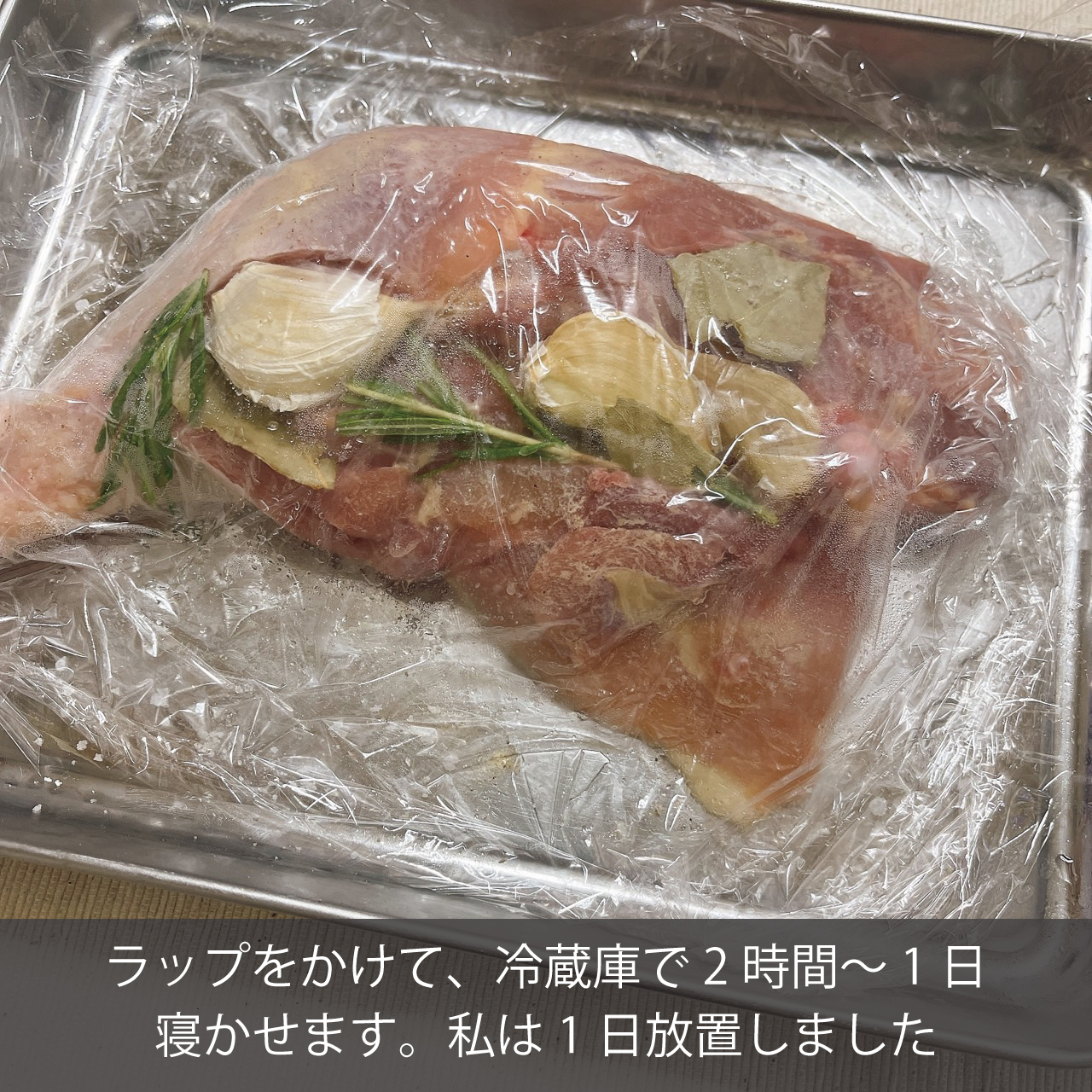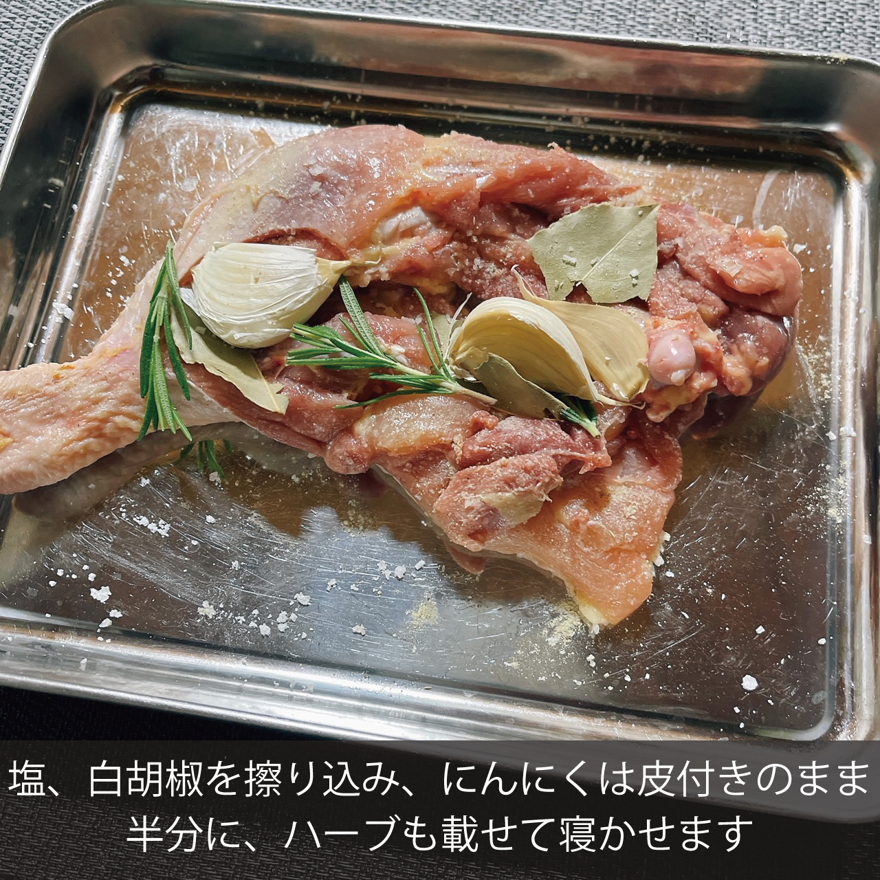 塩、白胡椒、ハーブ、にんにくを擦り込みマリネで1日おくのでとにかく時間がある時がおすすめです。食べる二日前位に仕込むイメージですかね。