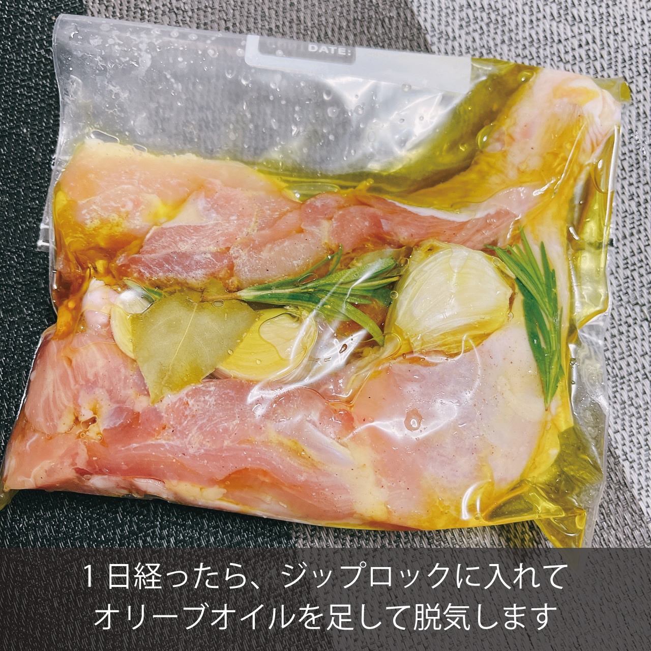 ④ジップロックに鶏肉、ハーブ、にんにくをそのまま入れ、オリーブオイルを40ml足して脱気します。