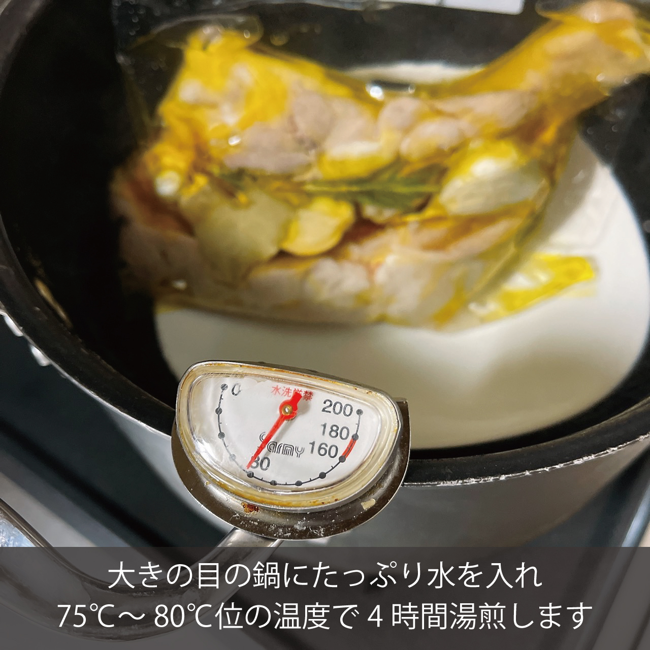 ⑤大きな鍋に水を入れ80℃で4時間湯煎でオイル煮にしていきます。